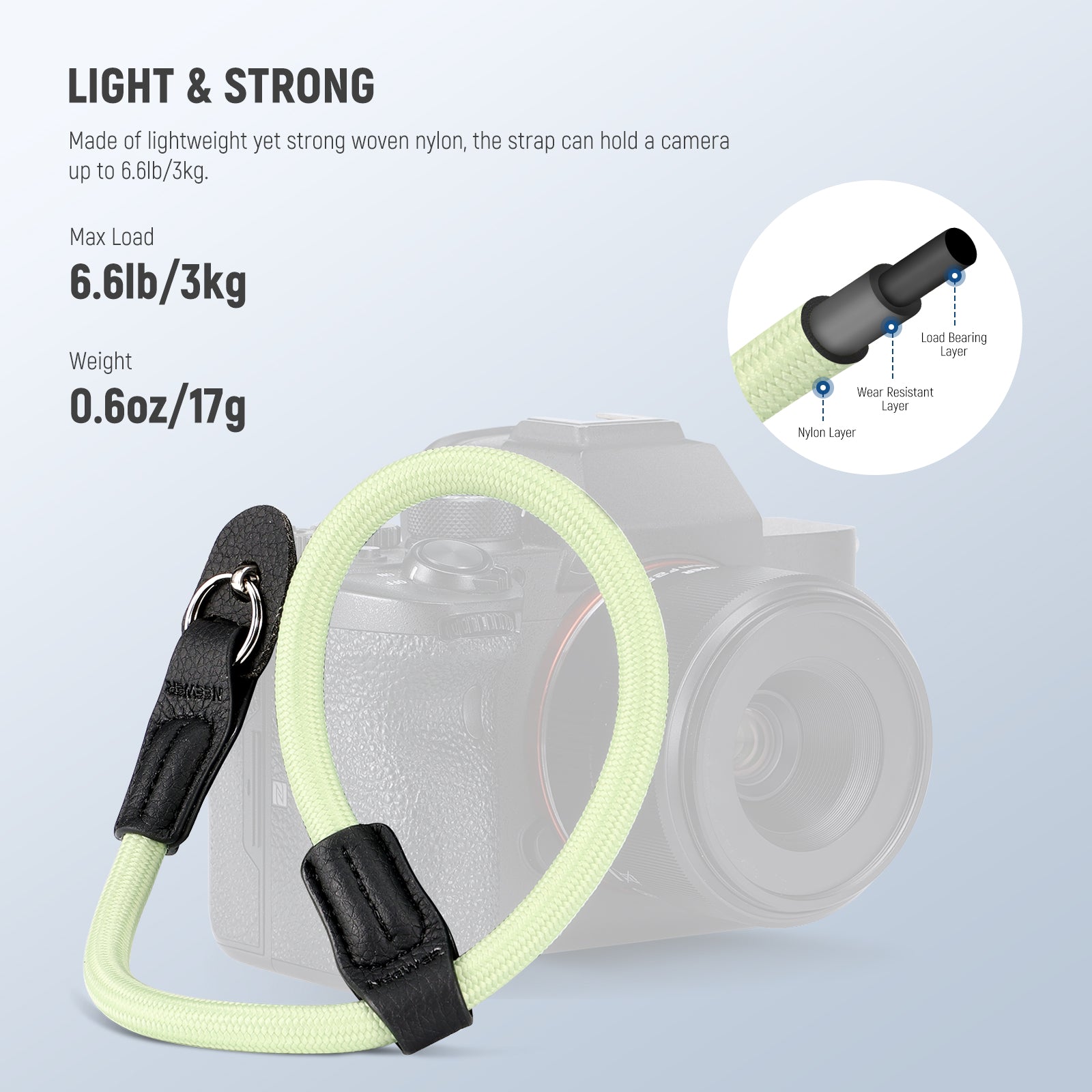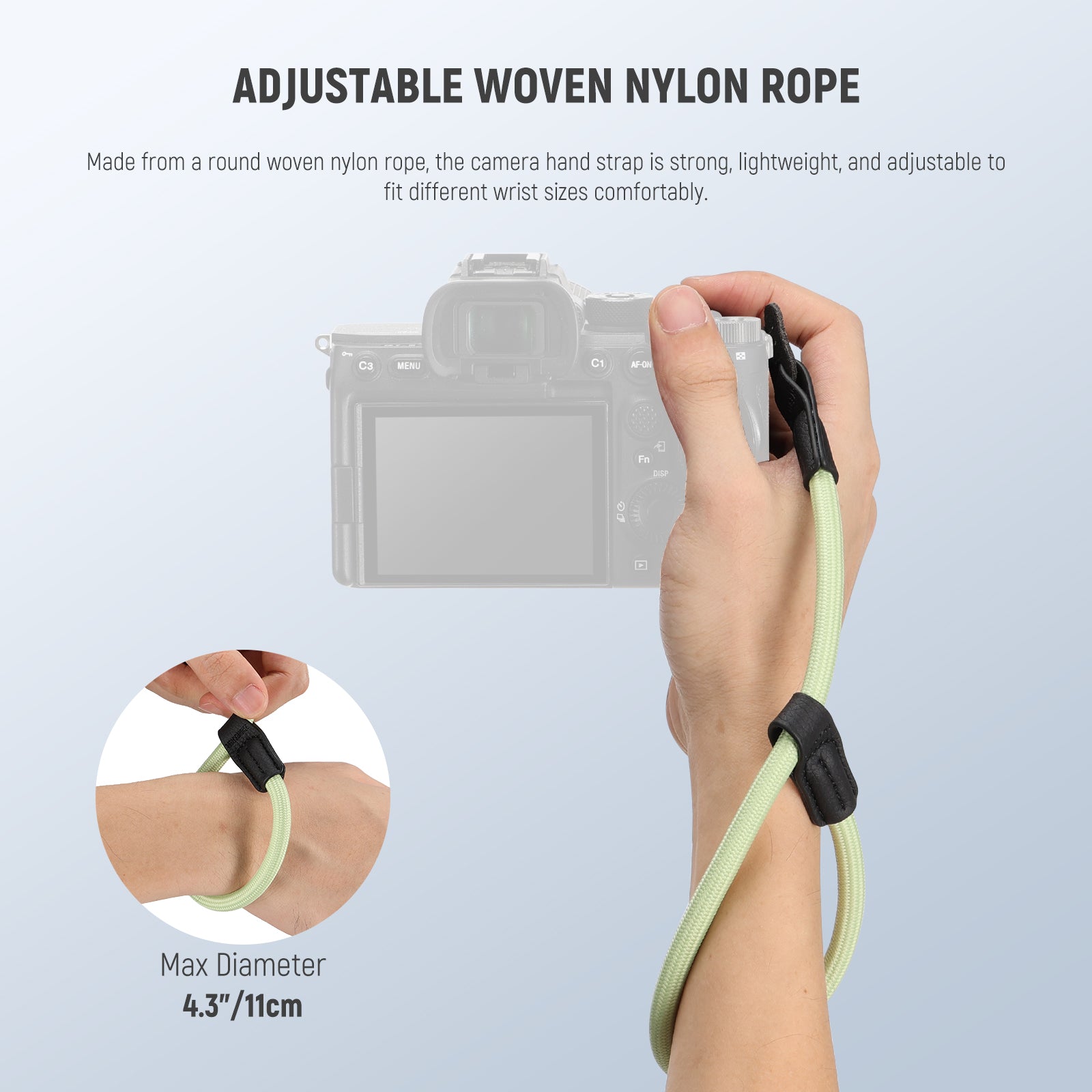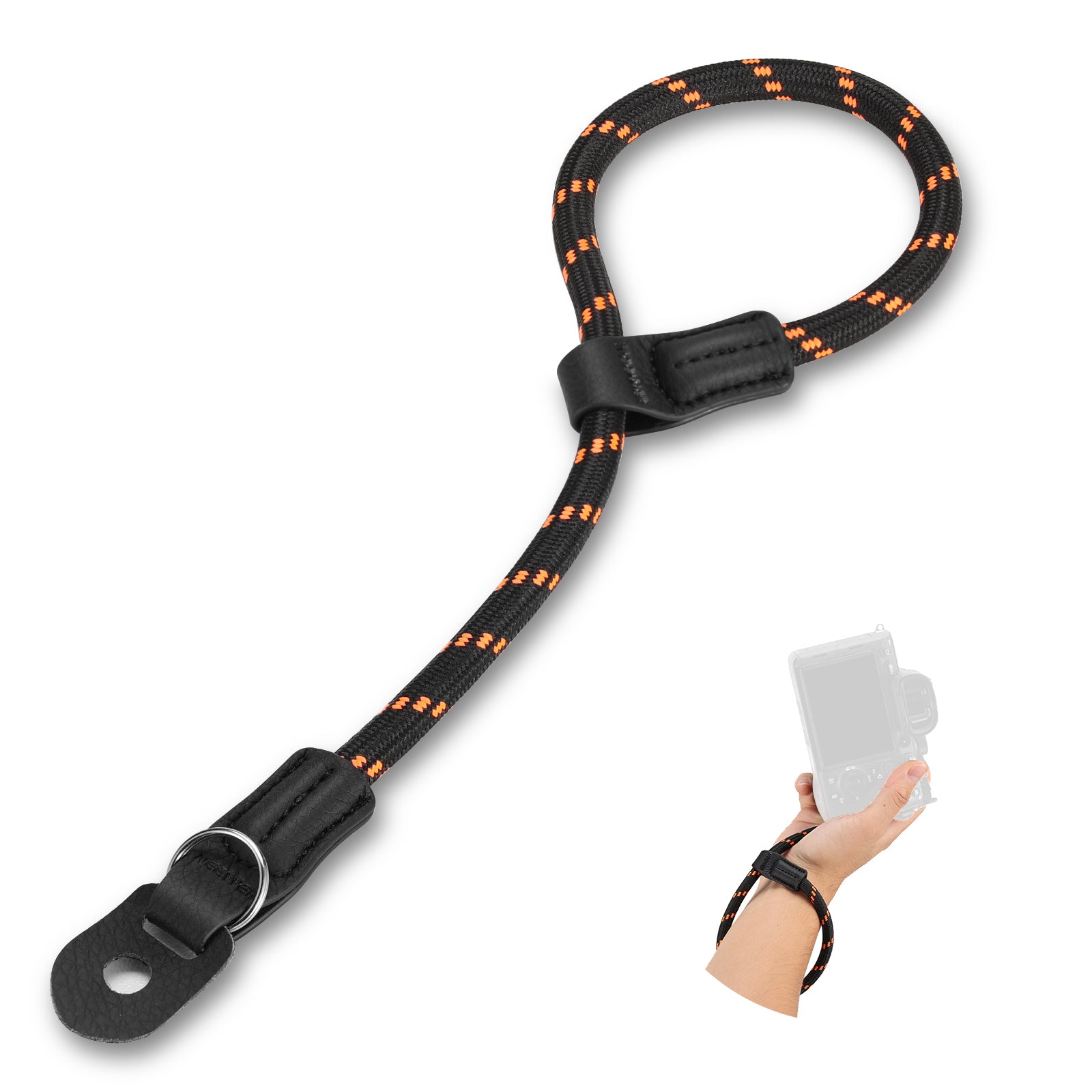 - Adjustable Woven Nylon Rope- Made from a round woven nylon rope, the camera hand strap is strong, lightweight, and adjustable to fit different wrist sizes comfortably