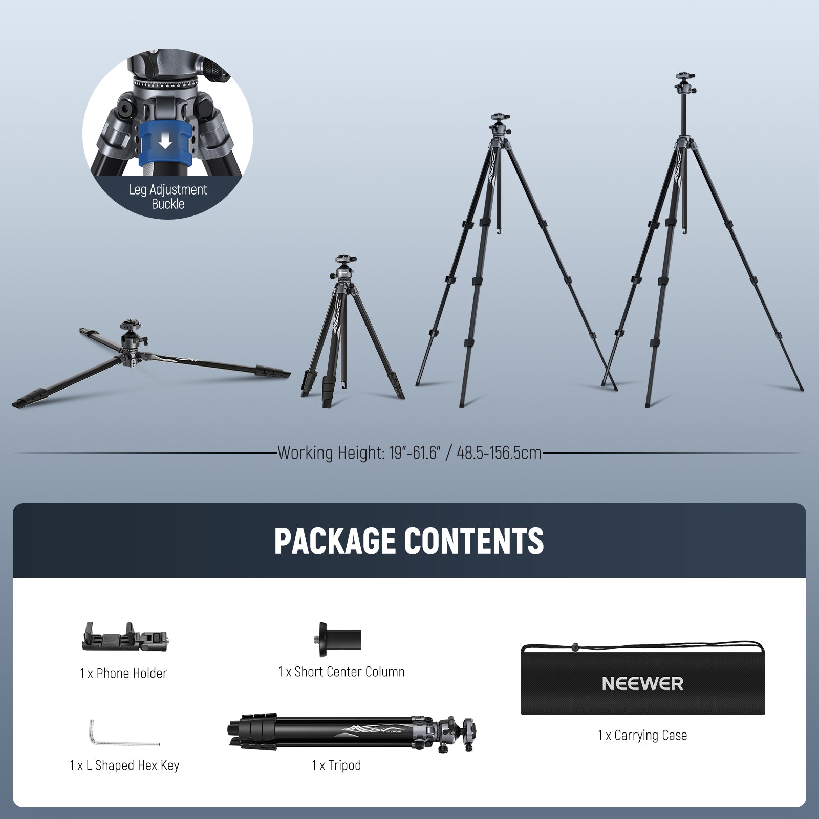 • Superior Stability Compact Travel Tripod- Crafted from aluminum alloy, this LT07 portable camera tripod weighs just 2.9lb/1.33kg and heavy duty to support up to 22lb/10kg. Tightly fitted legs fold down to a 2.2"/5.7cm diameter and 20.5"/52cm length for easier single hand grip, with 4 section tube legs for adjustable height (19"/48.5cm to 61.6"/156.5cm) and 3 fixed opening angles (22°, 55°, and 85°). The non slip rubber feet ensure stability and with a storage bag for easy transport