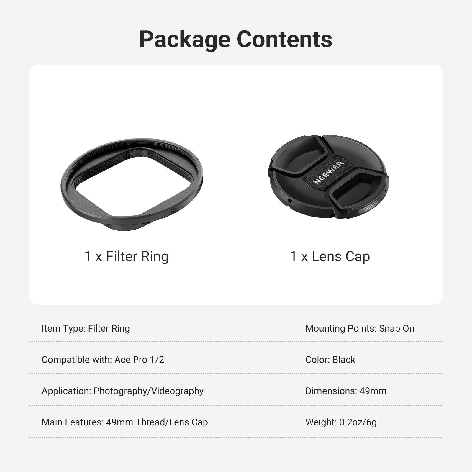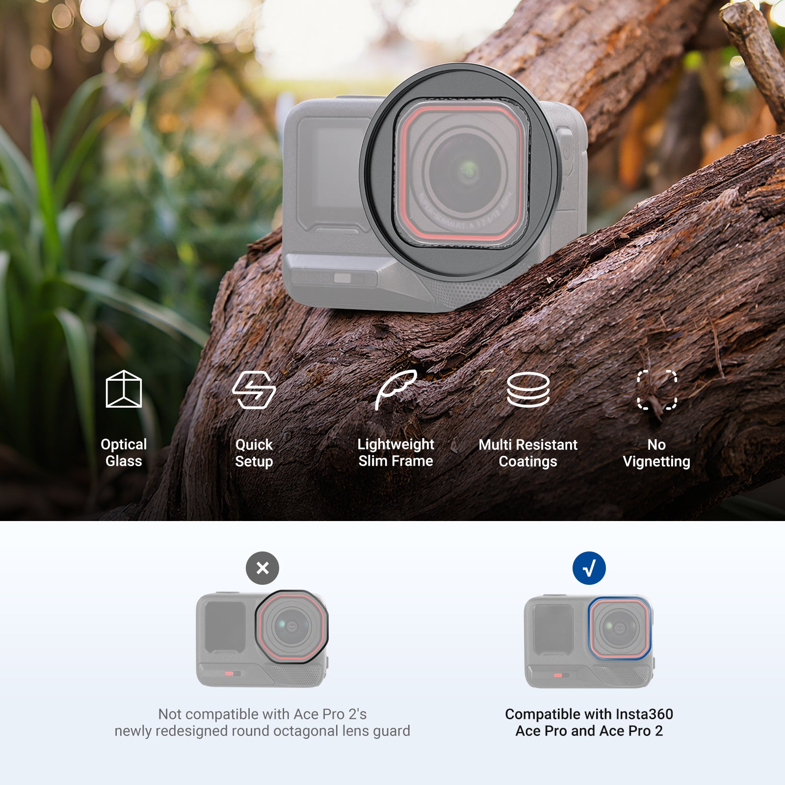 - For Ace Pro 1 / Ace Pro 2- Compatible with Insta360 Ace Pro 1 and Insta 360 Ace Pro 2 action cameras. This 49mm lens filter adapter ring will not interfere with the camera functions or the use of photography accessories