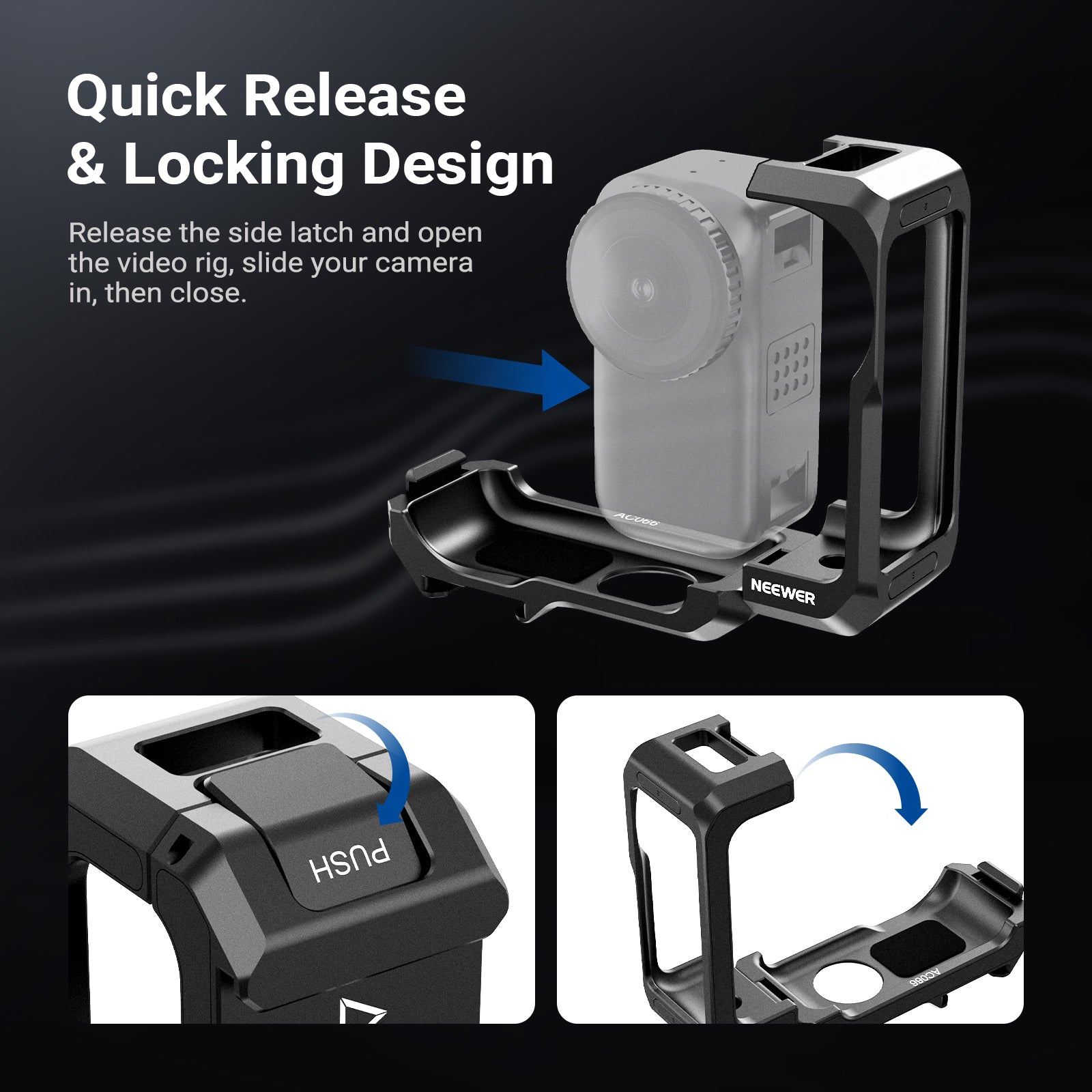 - Quick Release & Locking Design- Release the side latch and open the video rig, slide your camera in, then close. No assembly required