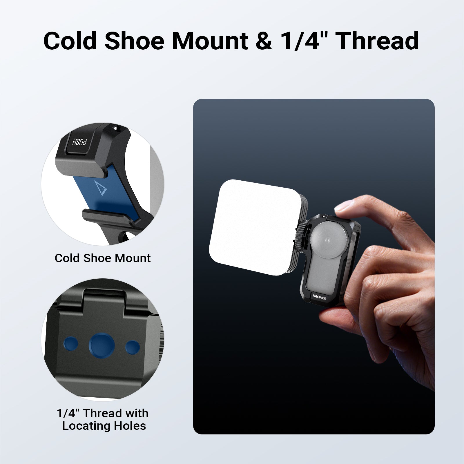 - Cold Shoe Mount & 1/4" Thread- Built with a cold shoe mount and 1/4" thread with locating holes to attach small LED lights, microphones, tripods, selfie sticks, and other equipment gear