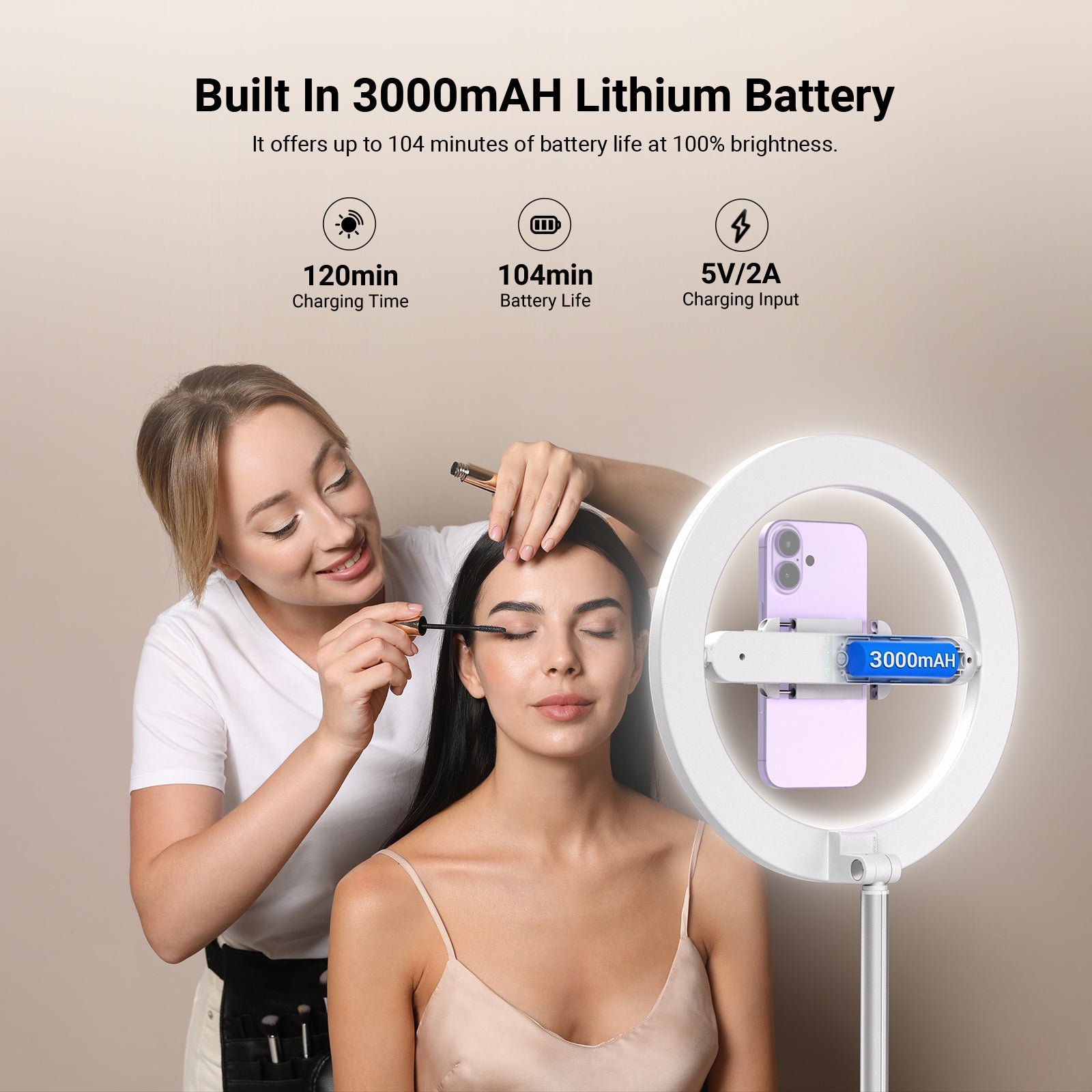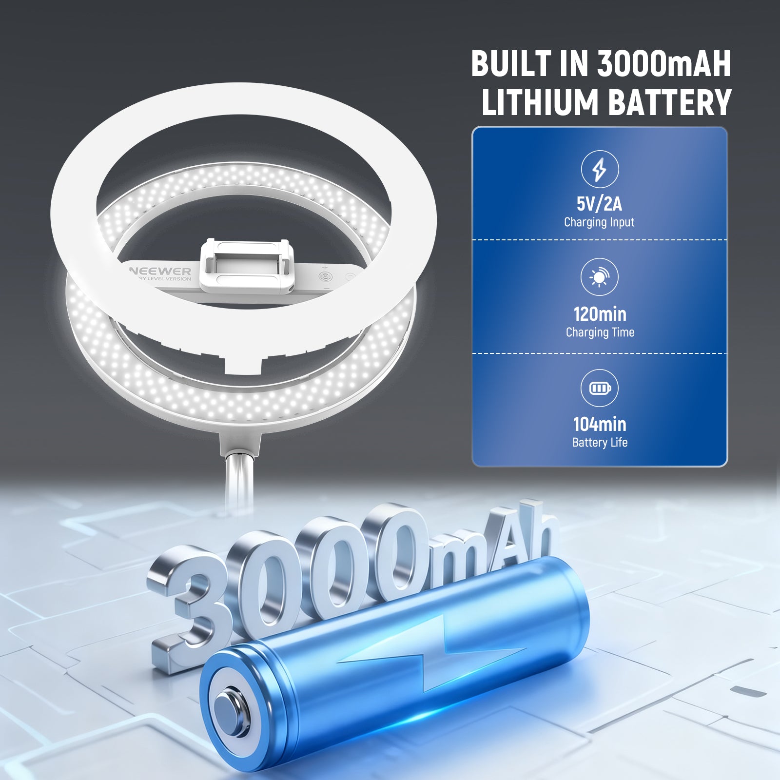 • Built in 3000mAh Battery & USB Powered- With a built in 3000mAh rechargeable battery, the selfie light offers up to 104 minutes of runtime at 100% brightness. It also supports direct 5V/2A or 5V/1A USB power input to provide continuous lighting for uninterrupted shooting. NOTE: For optimal battery longevity, please fully charge the device before first use