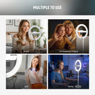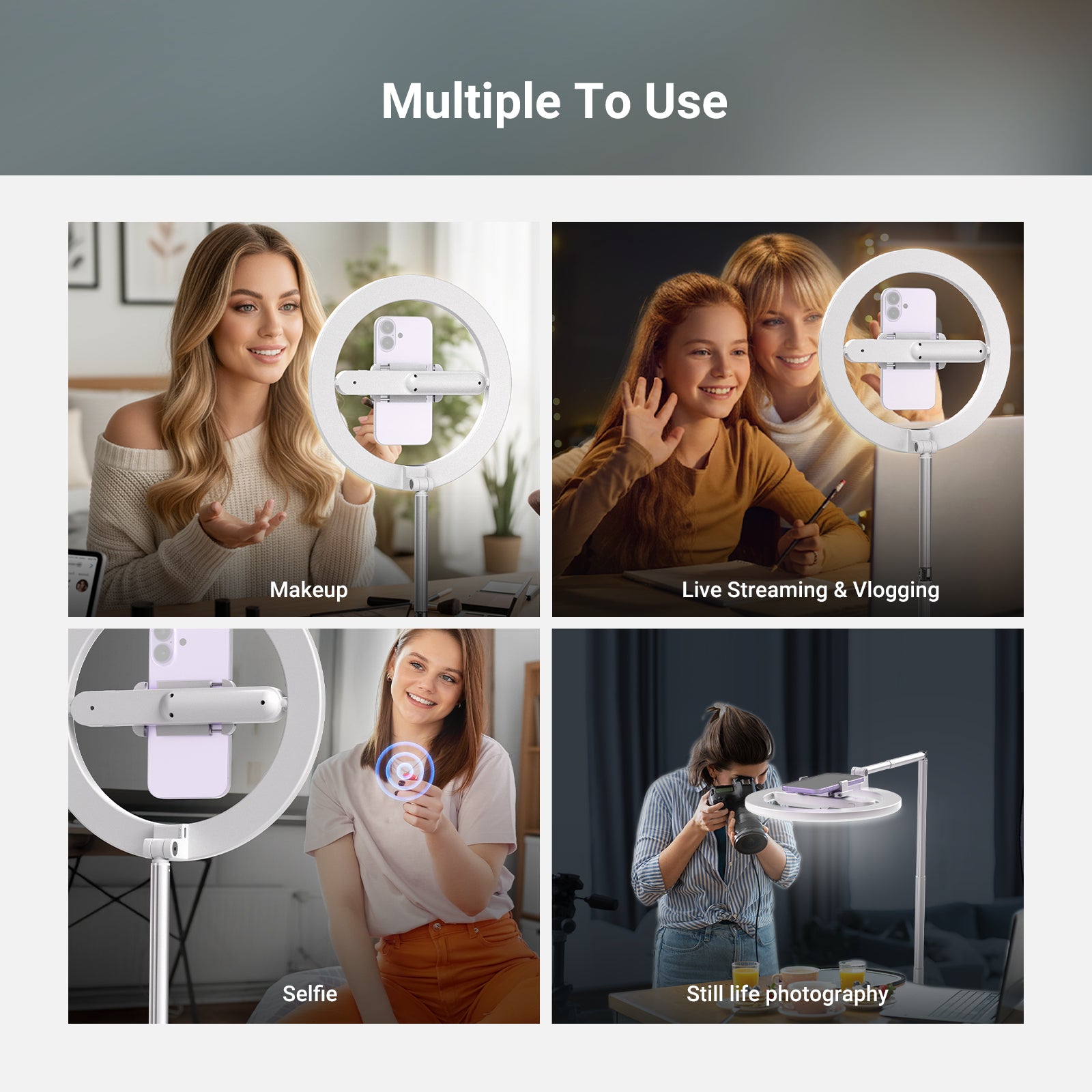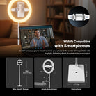 • Ideal for Phone Photography- A 360° universal phone mount secures your phone at the center of the portable LED ringlight, delivering direct, diffused soft light for optimal photo and video quality in portrait & landscape modes. This large ring light with stand for video recording selfie filming vlogging, is compatible with iPhone 16 15 Pro Max Plus Samsung S24 Ultra cell phone, etc. Essential accessories and must have phone camera lighting gear for social media content creators and influencers