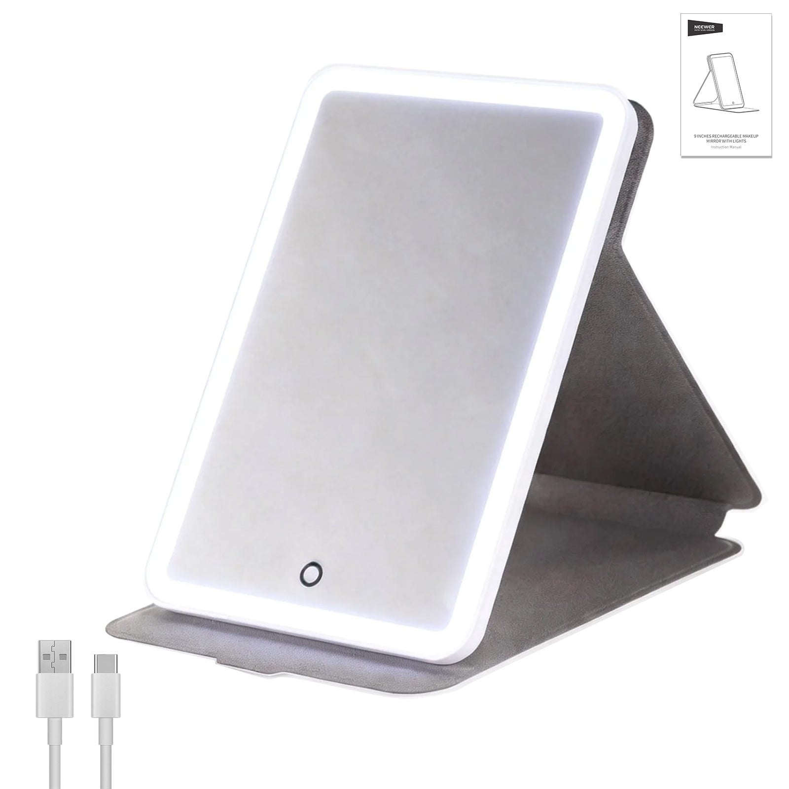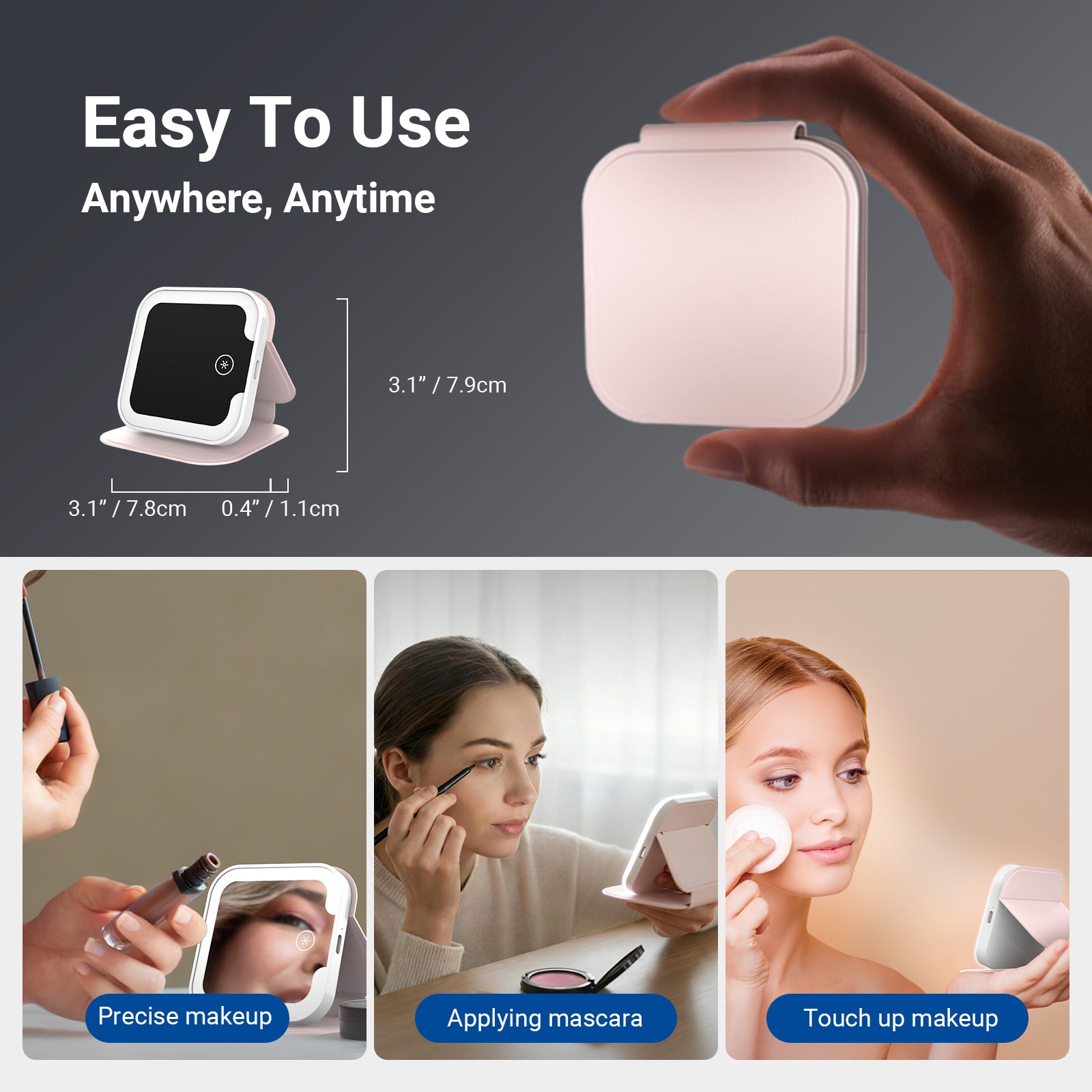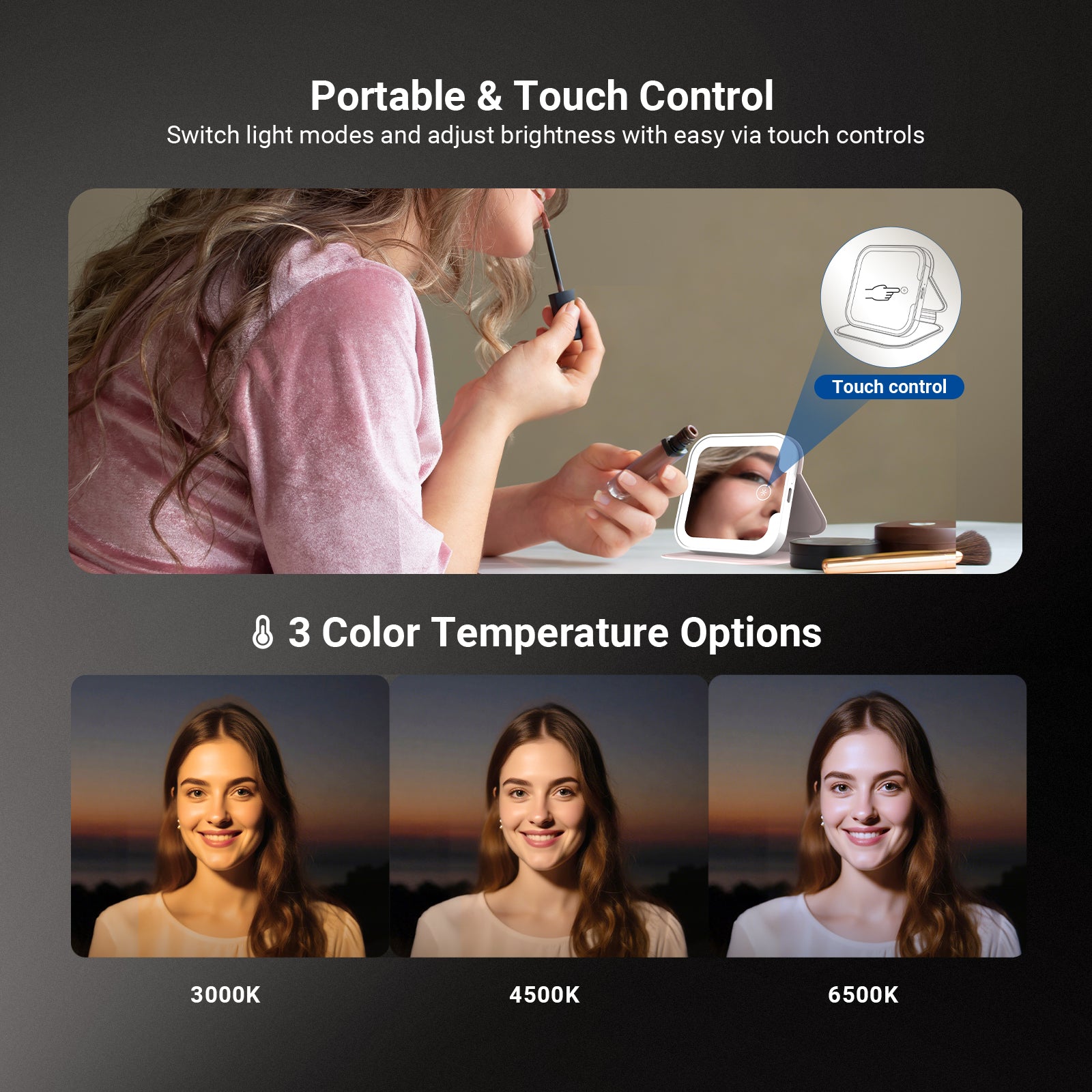 - Portable & Touch Control- The LED lighted vanity make up mirror folds into a compact 3.1"x3.1"x0.4" size for easy travel, and also forms a stable triangular desk (table) stand for desktop (tabletop) face makeup lighting. Switch light modes and adjust brightness with ease via touch controls