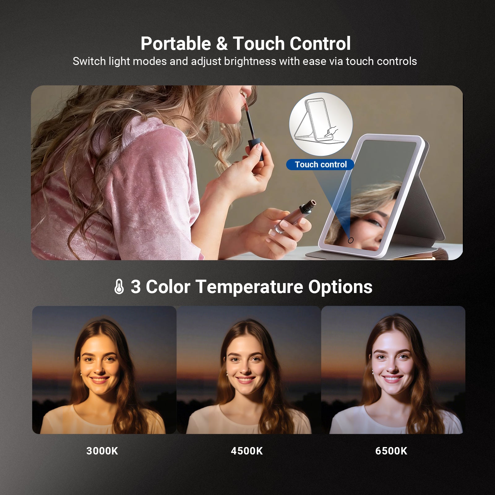 - Adjustable Lighting- The lighted vanity mirror features 24 bi color LEDs around the edge, delivering soft, adjustable illumination with warm, cool, and neutral light modes to ensure precise makeup application