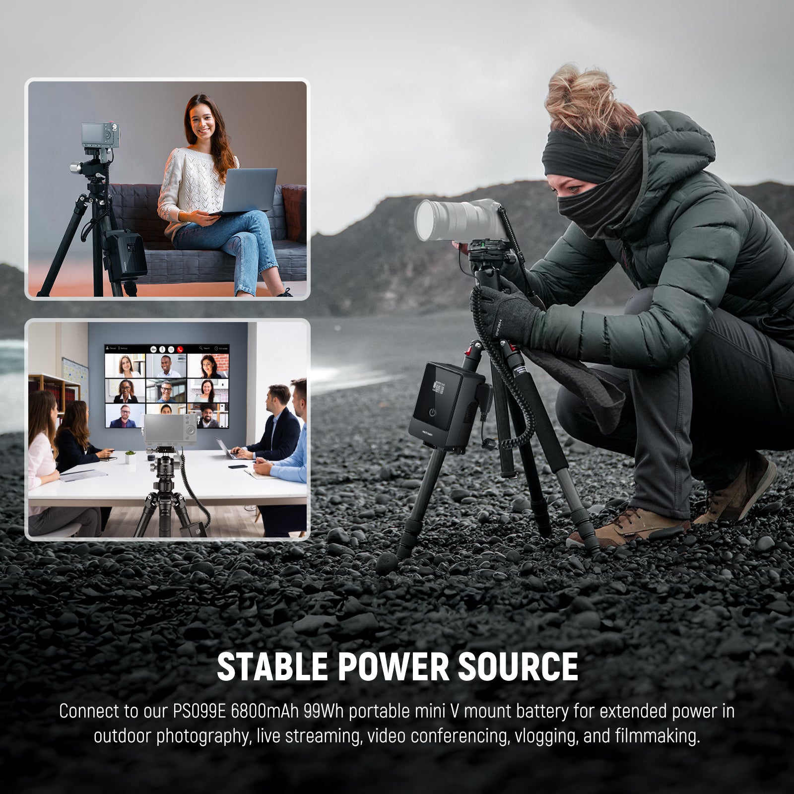 Beyond power and portability, mini V-mount batteries offer a clean, all-in-one solution with multiple output ports, including D-Tap and USB-C, allowing you to run cameras, lights, and accessories from a single battery. Their secure V-lock connection, durable design, and airline-friendly capacity make them perfect for run-and-gun shooting, travel, and remote locations where access to outlets is limited. Unlike USB power banks, which can be unstable under heavy loads, mini V-mounts provide safe, stable, and professional-grade power, giving creators the freedom to focus on capturing the shot without worrying about their gear.