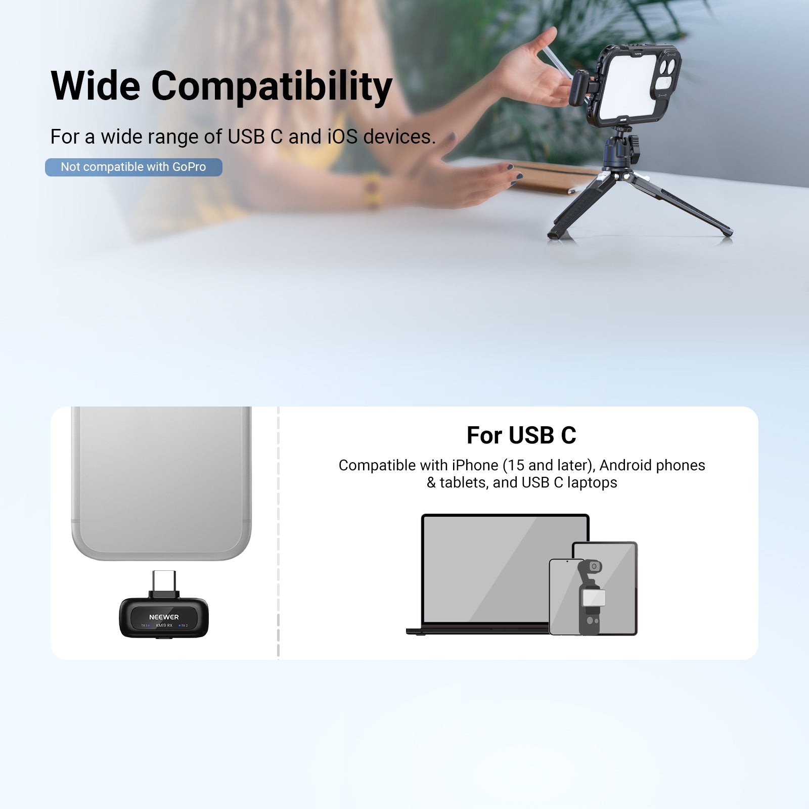 - Clip On Lav Wireless Microphone- Compact like earbuds, this small lavalier mic system includes a little plug & play USB C receiver (RX; 0.1oz/3g), two transmitters (TX; 0.2oz/6g each), and a charging case. One tiny adapter compatible with older iPhone iPad for vlog/content vlogging, one external adapter compatible with iPhone 17 16 15 Pro Max Mac Android phone tablet computer laptop. Not compatible with GoPro