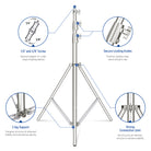 - Heavy Duty Light Stand- Made of stainless steel, the rust resistant photography lighting tripod is designed for rugged use, supporting LED video lights, ring lights, monolights, strobes, softboxes, reflectors, and other equipment up to 22lb/10kg