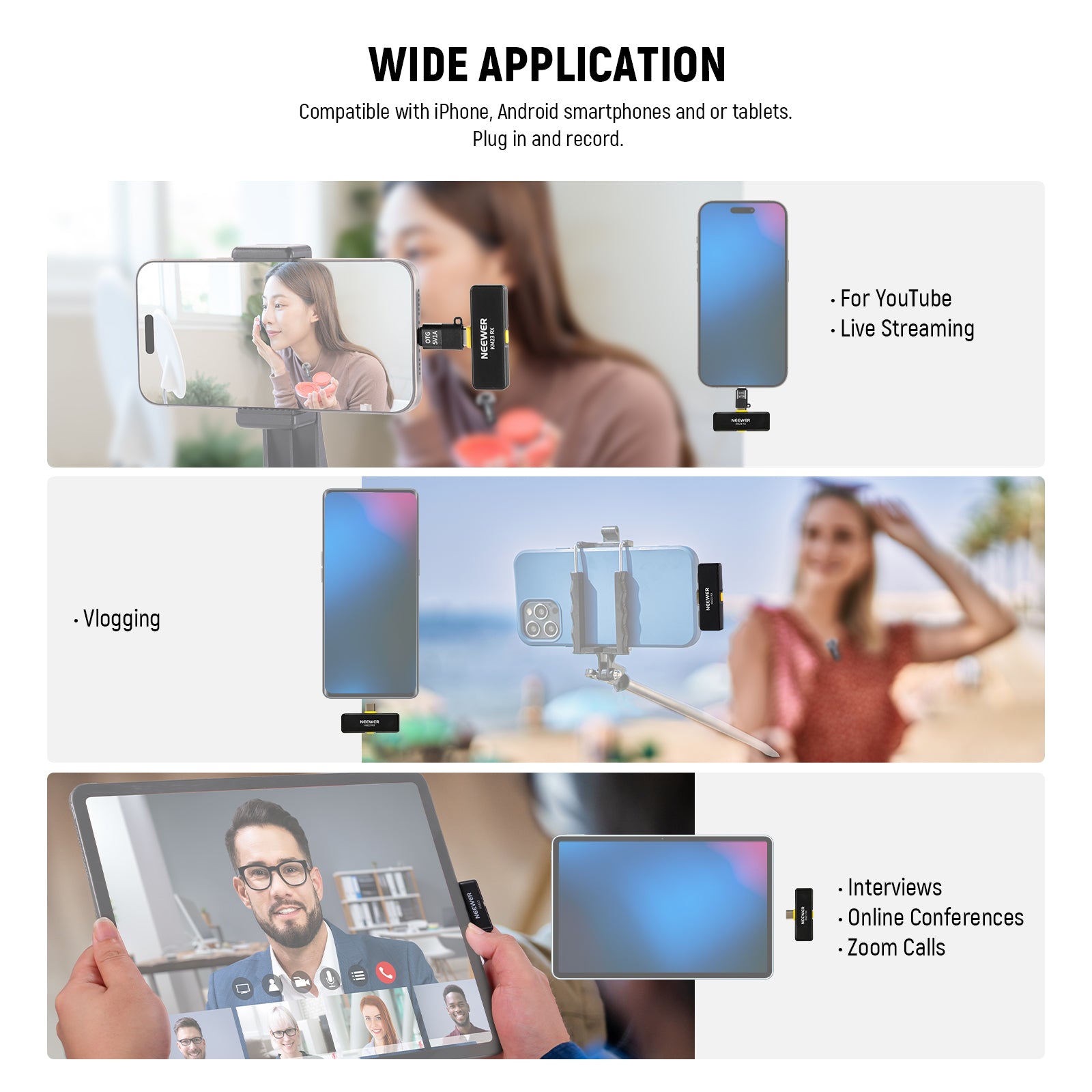 NEEWER microphones and accessories can meet your needs, including live streaming, video recording, gaming broadcasts, and more. Our collection includes wireless Lavalier microphones, gaming mics, microphone booms, and other options. Compact and easy to store, these microphones and accessories are also highly portable, making them perfect for outdoor videography.
