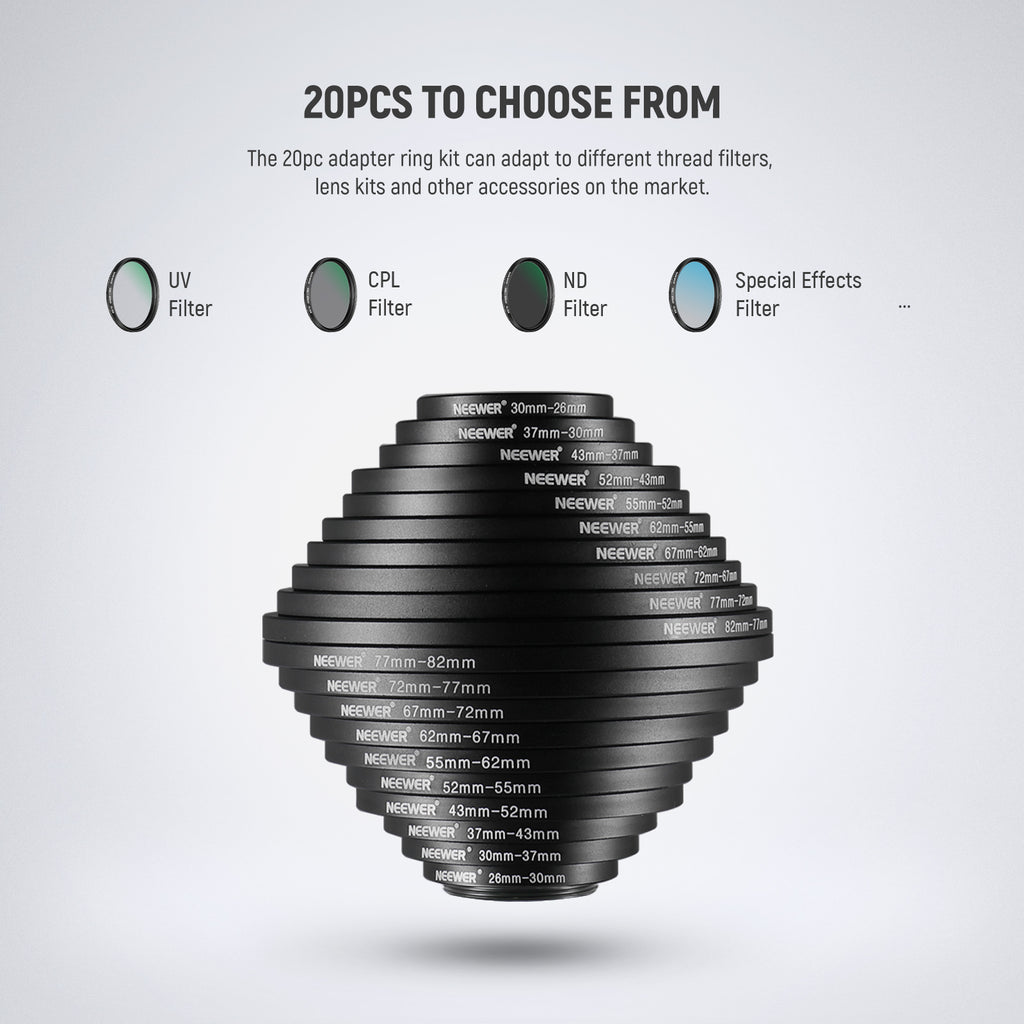 NEEWER 20 Pieces Anodized Black Metal Lens Filter Adapter Ring Kit