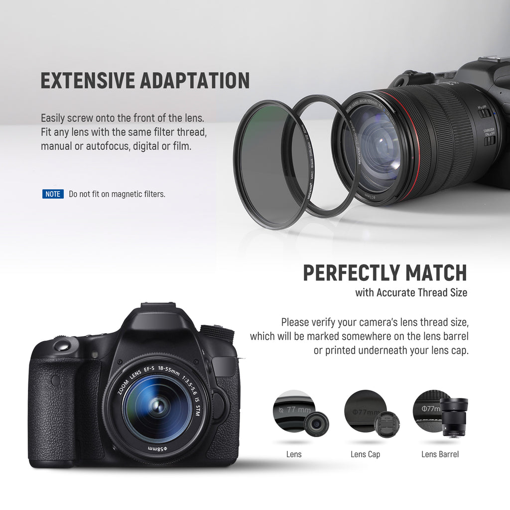 Note:?Please verify your camera's lens thread size. Your camera's lens thread size will be marked somewhere on the lens barrel or printed underneath your lens cap. This number is always preceded by a "?" (diameter) symbol. For example: ?37 = 37mm lens thread size.