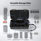 - Versatile Storage Slots- 17 dedicated slots keep everything tidy and organized. 1x Pocket 3 slot; 4x ND Filter slot; 2x Wide Angle Lens slot; 2x OTG Adapter slot; 2x Micro SD Card slot; 1x Mic 2 Transmitter slot compatible with DJI microphone such as mic mini or mic 2; 1x Windscreen slot; 1x Handle with 1/4" Thread slot; 1x Mini Tripod slot; 1x Battery Handle slot; 1x USB Cable slot