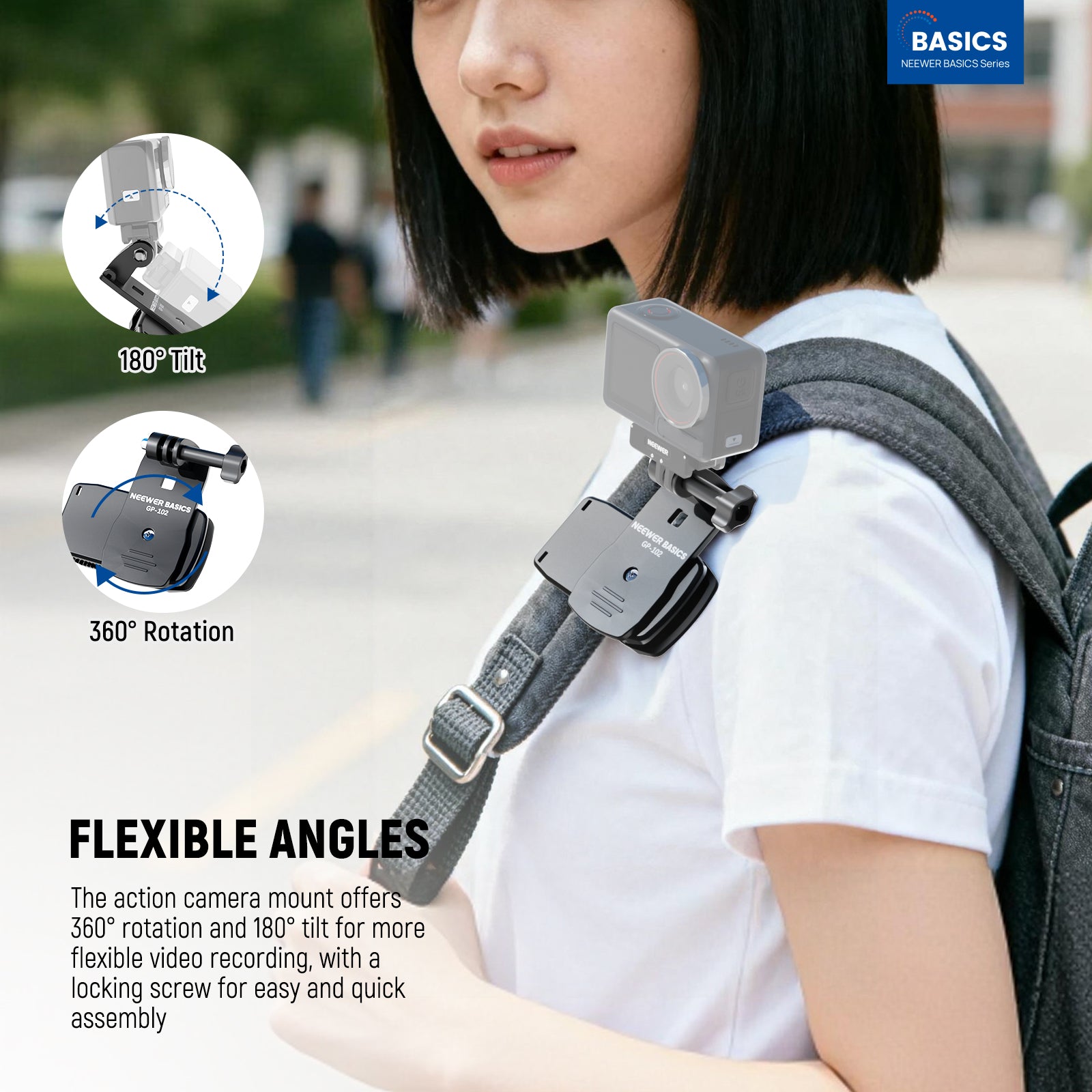 - 360° Rotation & 180° Tilt- The action camera holder mount offers 360° rotation and 180° tilt for more flexible video recording, with a locking screw for easy and quick assembly