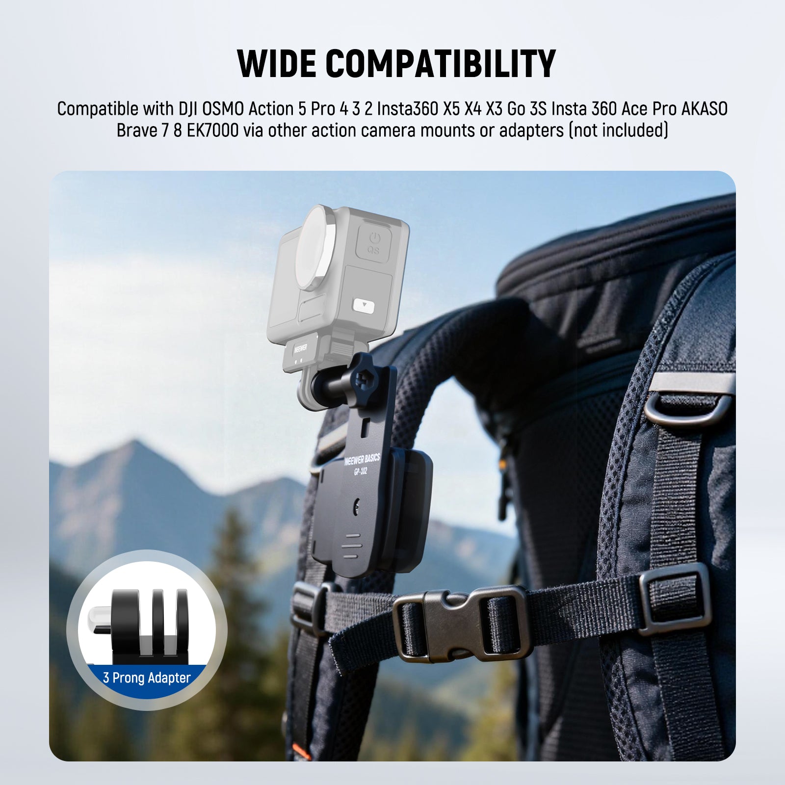 - Three Prong Adapter- Compatible with GoPro Max Hero 13 Go Pro 12 11 10 9 8 7 Black accessory pack and attachments; compatible with DJI OSMO Action 5 Pro 4 3 2 Insta360 X5 X4 X3 Go 3S Insta 360 Ace Pro AKASO Brave 7 8 EK7000 via other action camera mounts & clamps or photography accessories kit (not included)