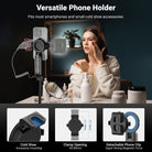 • 360° Universal Phone Holder- With a 2.4"-3.3"/60-85mm opening range, the phone clamp is compatible with iPhone 16 Pro Max iPhone 15 Pro Max Samsung Galaxy S24 Ultra and other smartphones. The 360° rotation allows for vertical and horizontal shooting, while the 225° tilt offers variable camera angles