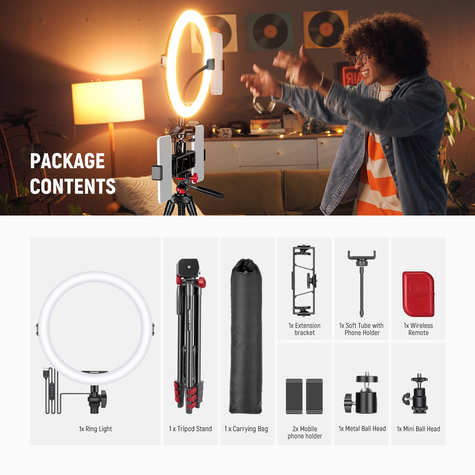 • Adjustable & Portable Tripod Stand- The 4 section aluminum alloy tripod extends from 15.7" to 54" (40-137cm) and folds down to 16.5" for easy transport as professional travel ring light. Quick release flip locks and a 3 way pan head with handle allow for fast height adjustment and precise ring light positioning. The pan head features a quick release plate for fast mounting and removal