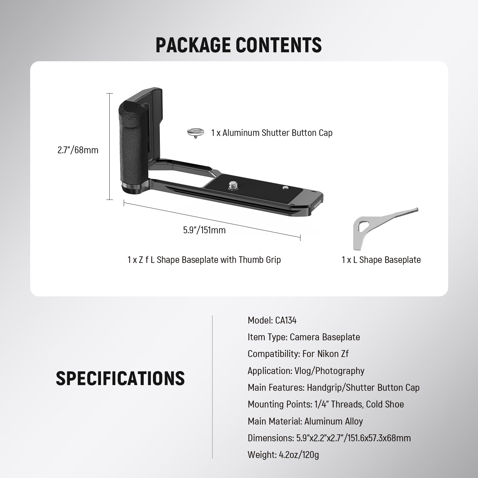 - Compatible with Nikon Zf Camera- Compatible with Nikon Z f digital mirrorless cameras, this retro formfitting baseplate is an homage to the classic film camera era. It attaches to the camera via a 1/4" screw and keeps the battery compartment fully accessible. Accessories include an elegant silver aluminum shutter button cap to enhance the tactile feel and the 2 in 1 wrench to simplify equipment setup for photography and videography