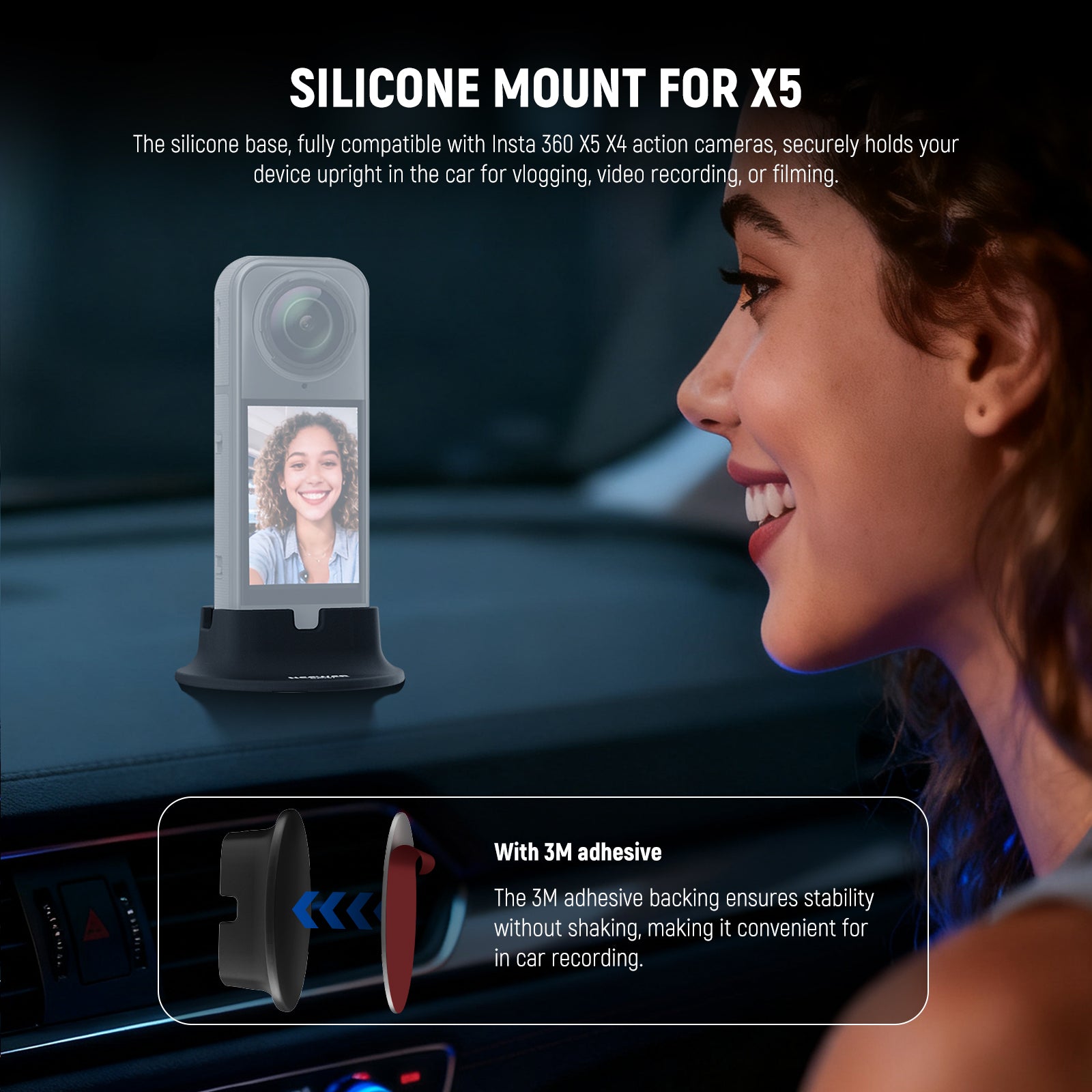 • Desktop Car Mount Compatible with Insta360 X5 X4- The silicone holder base is fully compatible with Insta 360 X5 X4 as action camera accessories, using the reusable adhesive on the bottom, to securely hold your device upright in the car for POV vlogging, video recording, or filming