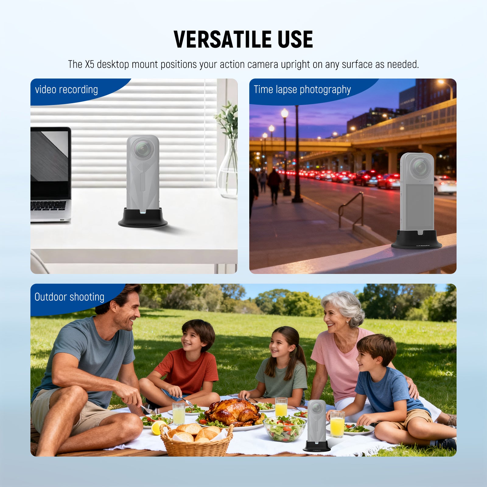 • Versatile Use- The X5 desktop mount positions your action camera upright on any surface, great for on location shots or time lapse photography as content creator essential influencer must have photography accessories and videography gears