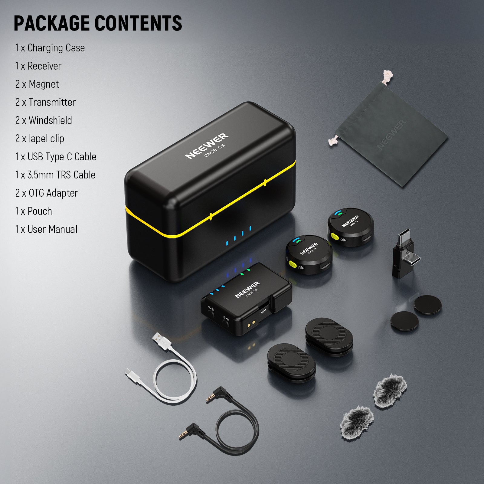 - Small Wireless Lav Microphone System- This little portable lavalier external mic accessories system includes one charging case, one receiver (RX), and two tiny transmitters (TX). With 3.5mm TRS and OTG adapters, this mini recording gear set is compatible with iPhone 16 Pro Max 15 iPad Mac Samsung Android USB type C cell phones and USBC tablets, PCs, laptops, computers, DSLR cameras, and camcorder equipment, for professional videos, podcast, vlogging, content vlog, filming, and more