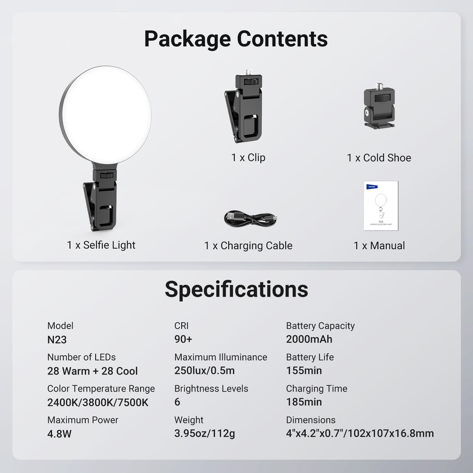 - Versatile- The clip on selfie photo ring light is compatible with iPhone iPad Android Samsung phones as recording and photography lighting accessories. Also a ringlight for desk laptop video conferencing, desktop computer webcam Zoom meetings/calls. Includes a cold shoe mount for camera use