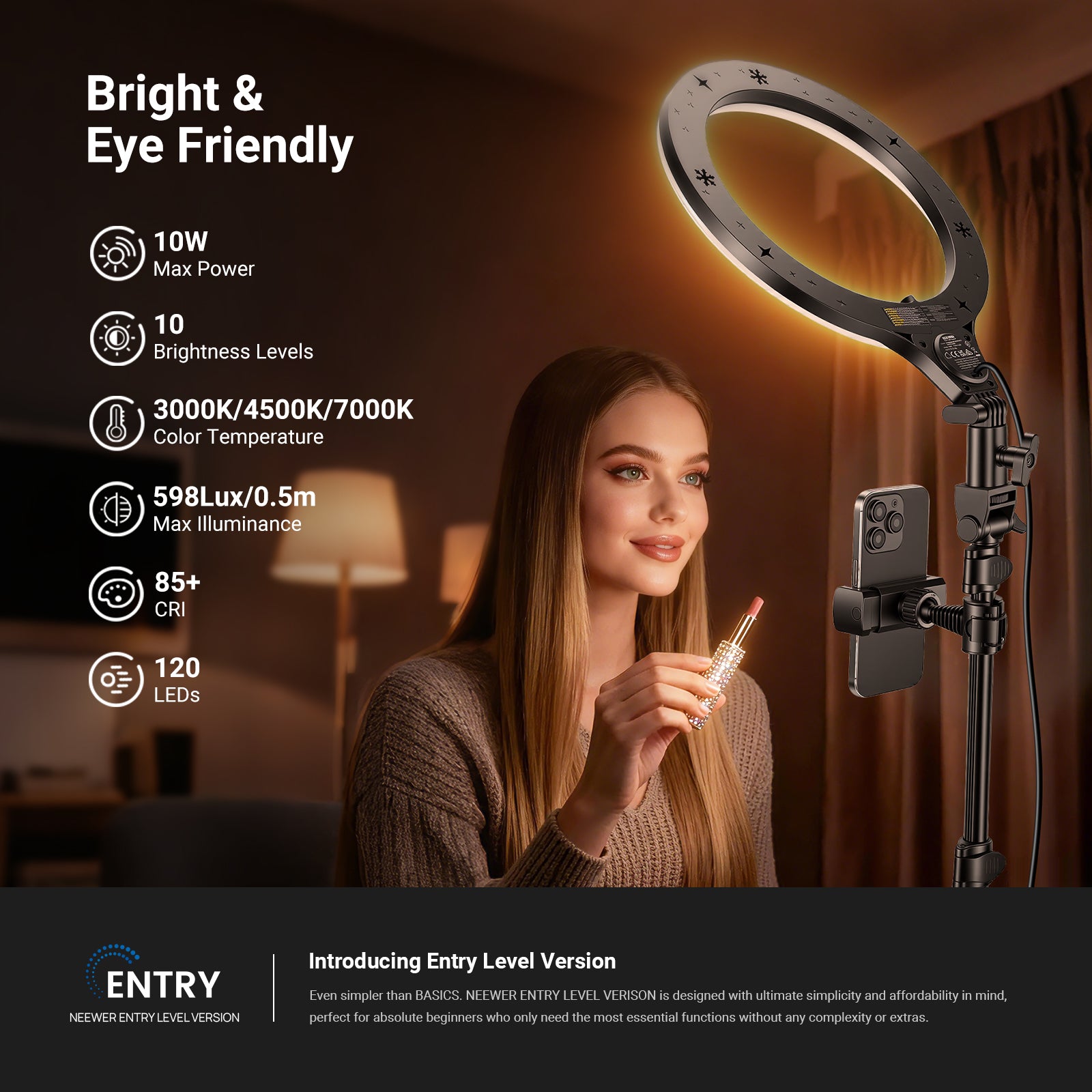 - Bright & Eye Friendly- NEEWER N43 selfie ring light with 120 bi color LEDs delivers continuous, soft, diffused illumination up to 598Lux/0.5m, with no shadows or glare, ideal for lash (eyelash) extensions, tattoos, estheticians. Built in timer with 3/6/9/12H lighting settings