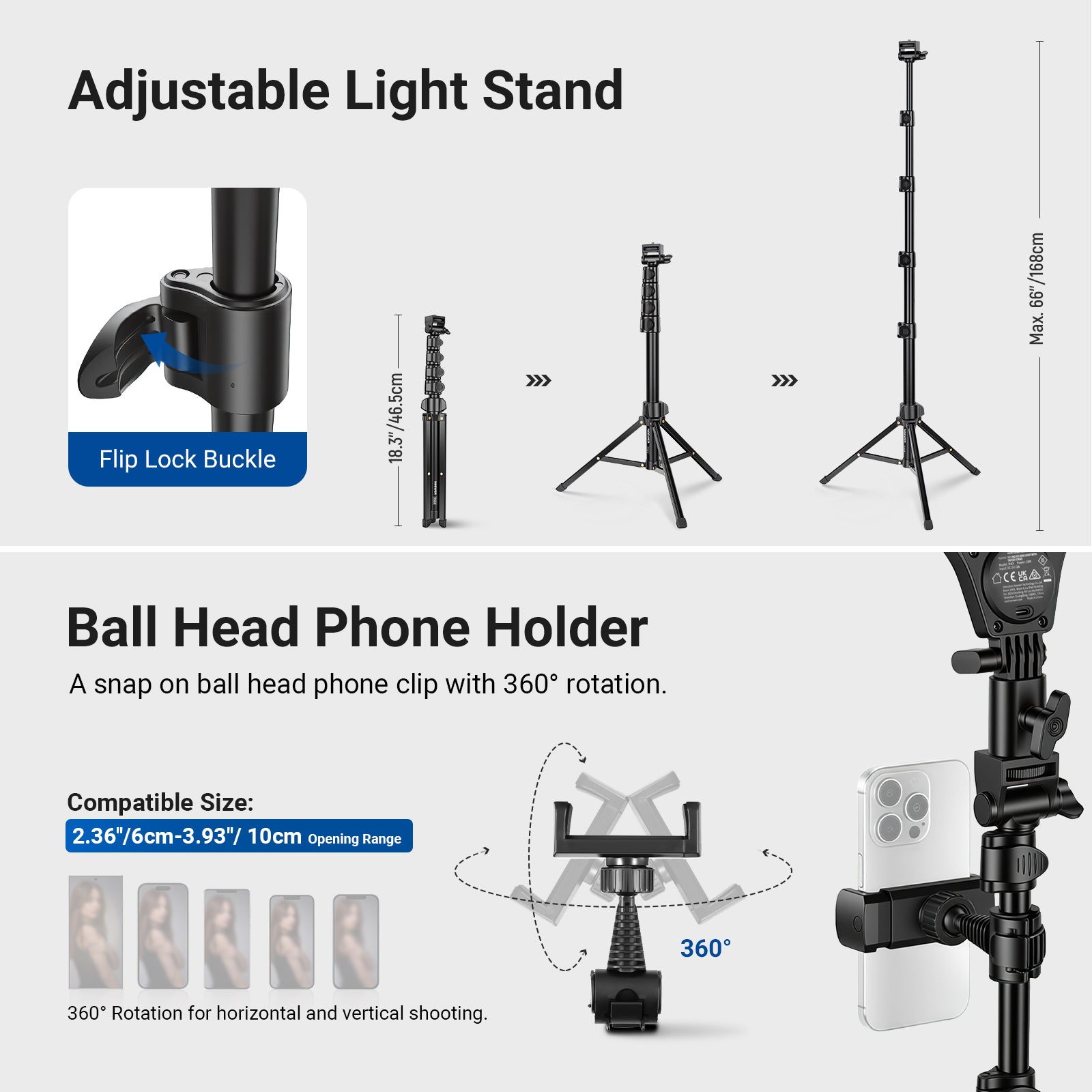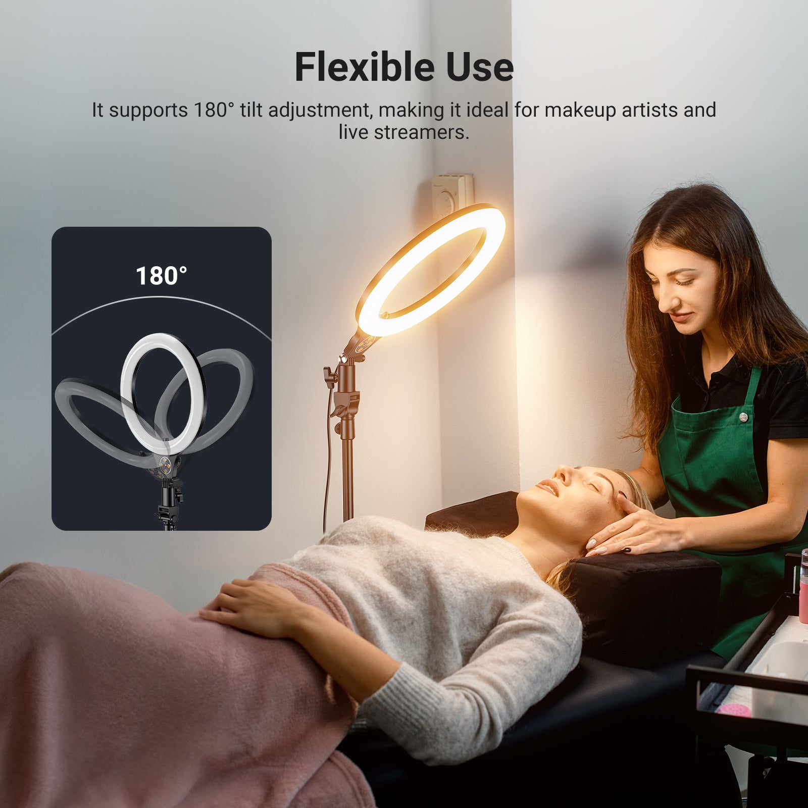 - Flexible Use- The large LED selfie ring light tilts 180°, with a tripod stand (up to 66") easily adjusted and locked via flip buckles, and an overhead phone camera mount for recording with ease. Portable photography accessories for travel makeup artists, streamer streaming