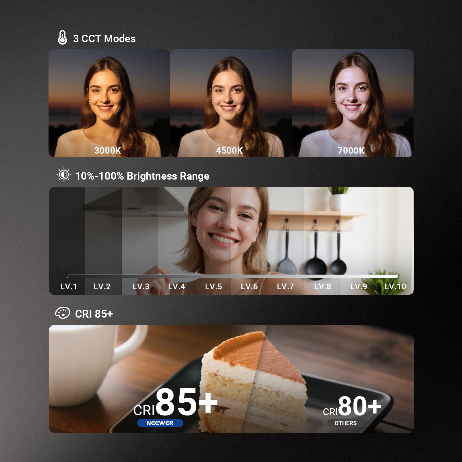 - Color Temperature Levels: 3000K/4500K/7000K