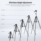 - Effortless Height Adjustment- The 4 section legs can be easily adjusted from 16.5"/42cm to 57.5"/146cm using flip locks. At the same time, the center column can be additionally elevated up to 10.2"/26cm, providing flexibility to capture every satisfying shot. Also with a hook on the bottom center column to hang weights for added safety