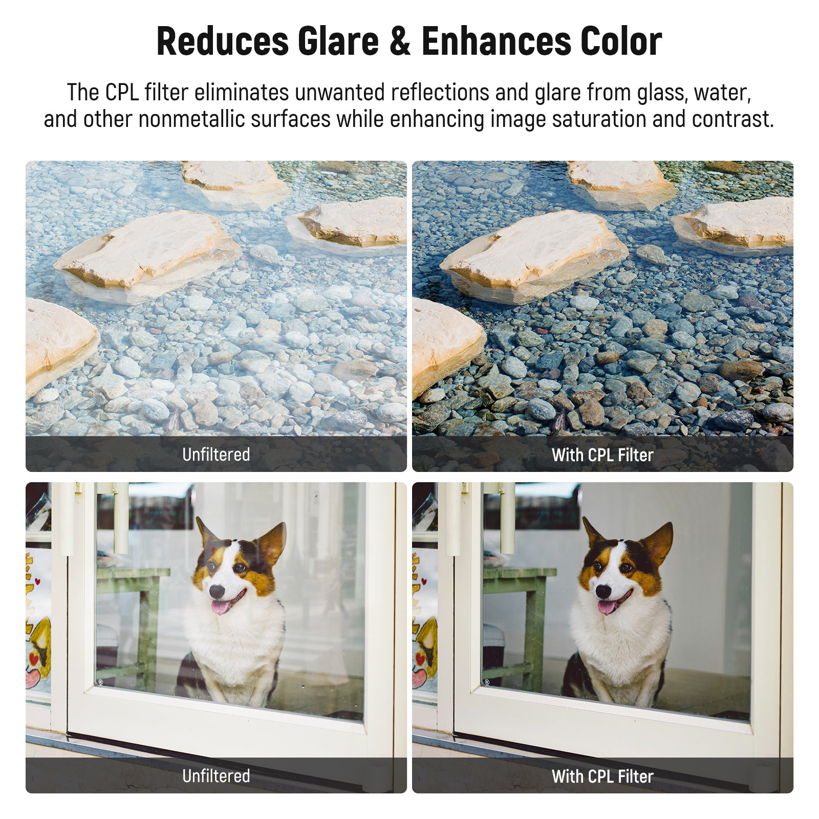 - Reduces Glare & Enhances Color- The CPL filter eliminates unwanted reflections and glare from glass, water, and other nonmetallic surfaces while enhancing image saturation and contrast