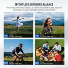 - Balanced Exposure for Superior Outdoor Shots- The ND8, ND16, ND32, ND64, and ND256 drone camera filters provide light reduction options of 3, 4, 5, 6, and 8 stops, respectively. These filters effectively control light intake for slower shutter speeds and prevent overexposure in varying sunlight conditions, contributing to cinematic motion blur for capturing epic footage during dynamic outdoor activities like aerial tracking shots