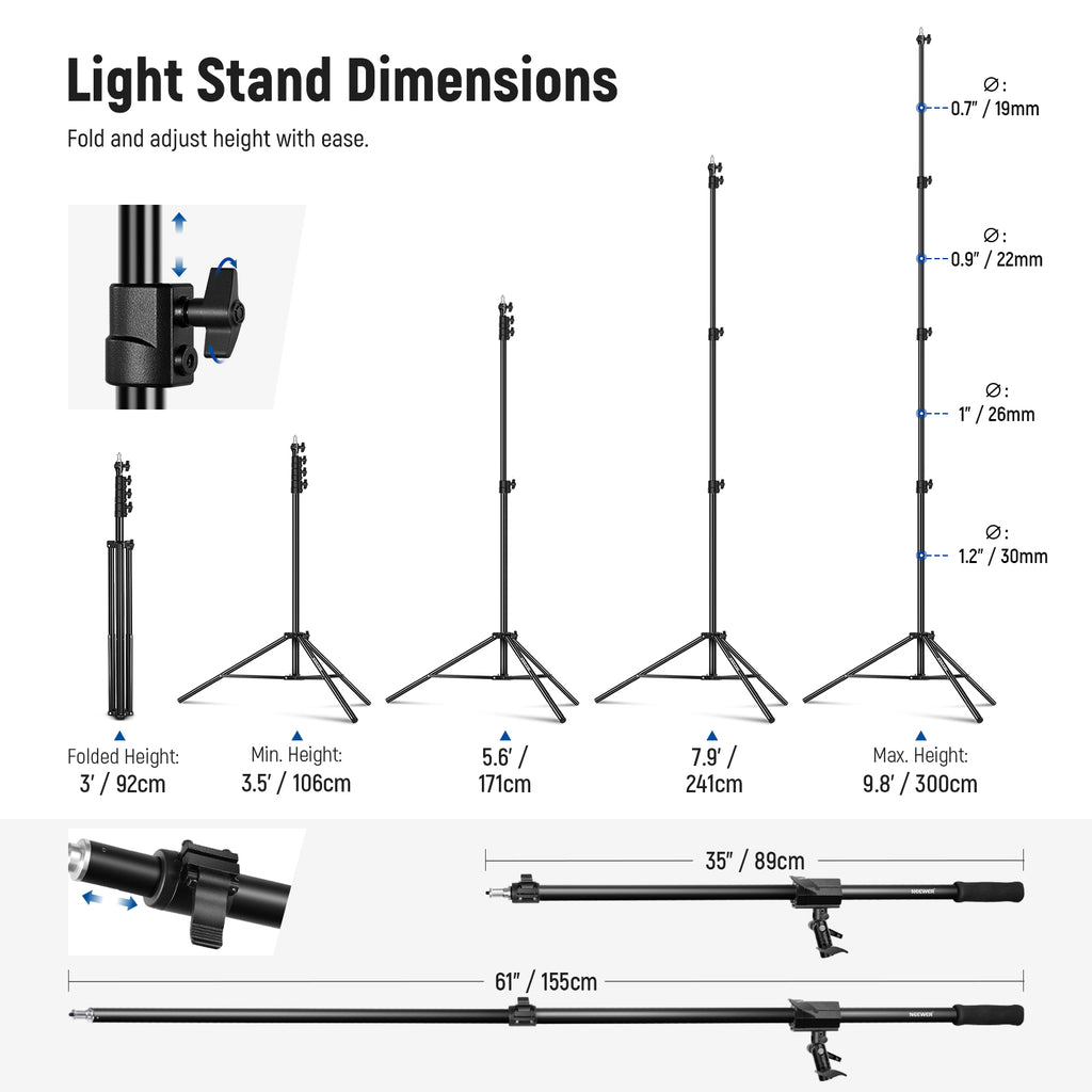 - Simple Height and Arm Length Adjustment- Easily adjust stand height by extending the 4-section telescopic column from 42"/106cm to 9.8'/3m and secure it at your desired height with the locking knobs. The two-section telescopic boom arm ranges from 35"/89cm to 61"/155cm in length. With a collapsible design and rubber padded feet, the stand is easy to carry and won’t scratch the floor, well suited for both outdoor and indoor shooting