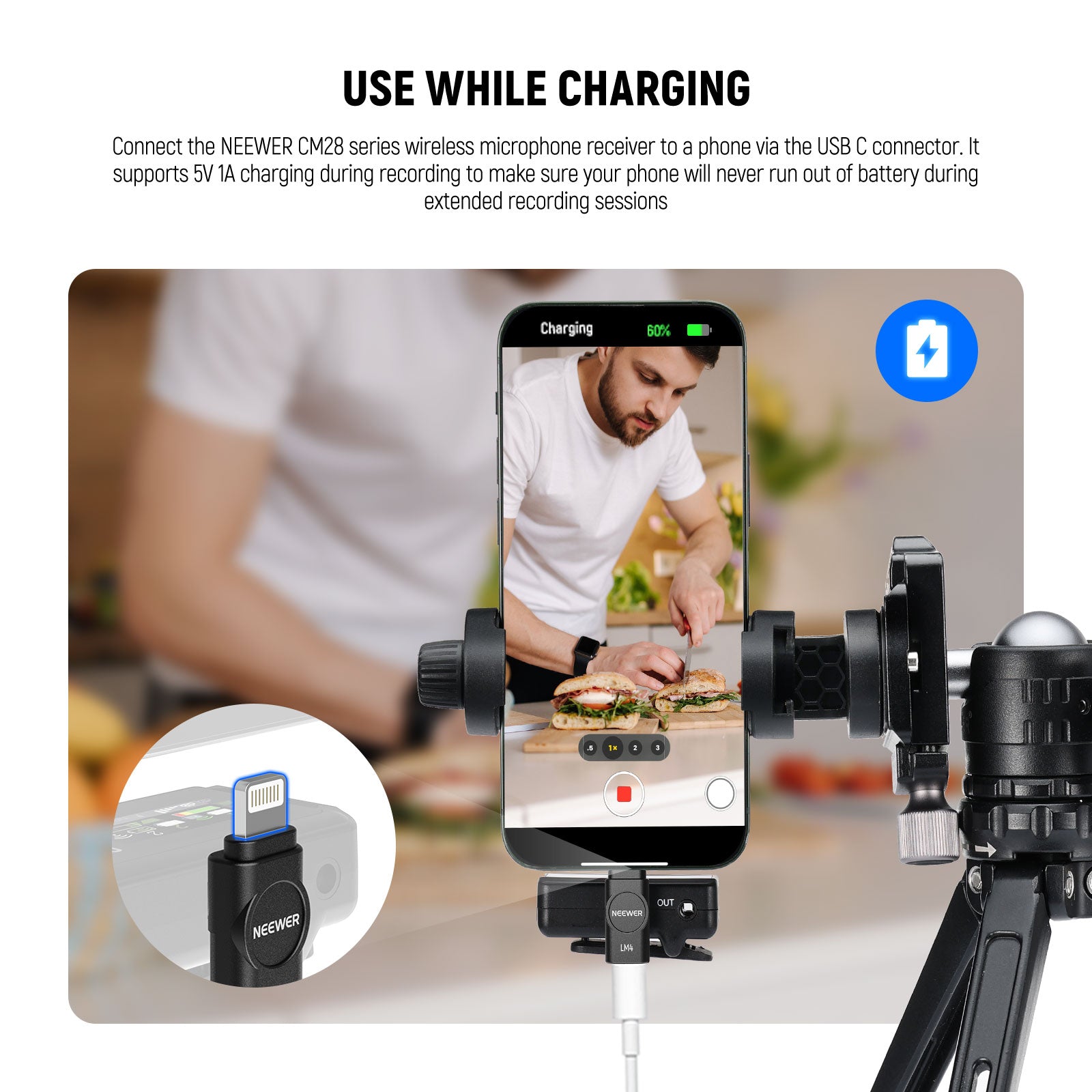 • How to Use- Connect the NEEWER CM28 series wireless microphone receiver to a phone via the USB C connector. It supports 5V 1A charging during recording to make sure your phone will never run out of battery during extended recording sessions