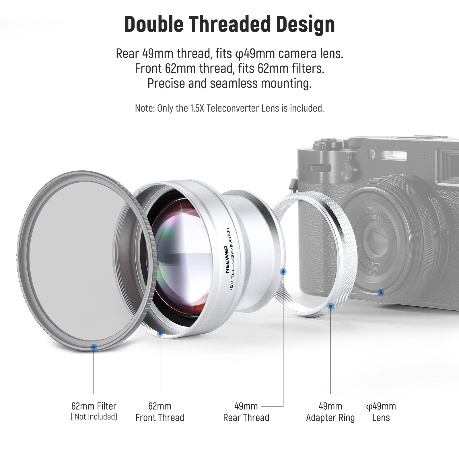 • Front 62mm and Rear 49mm Thread Design- This teleconverter features a 62mm front thread for attaching filters like UV, CPL, and ND. It is fully compatible with X100 Series cameras using a 49-49mm adapter ring. Without the adapter, it fits lenses with a 49mm thread