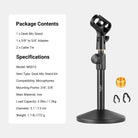 • Desktop Microphone Stand Kit- The tabletop mic stand features a 5.1" (13 cm) weighted metal base and non slip pads for added stability. Also includes a microphone clip mount, a 3/8" to 5/8" adapter, and two cable ties for easy use