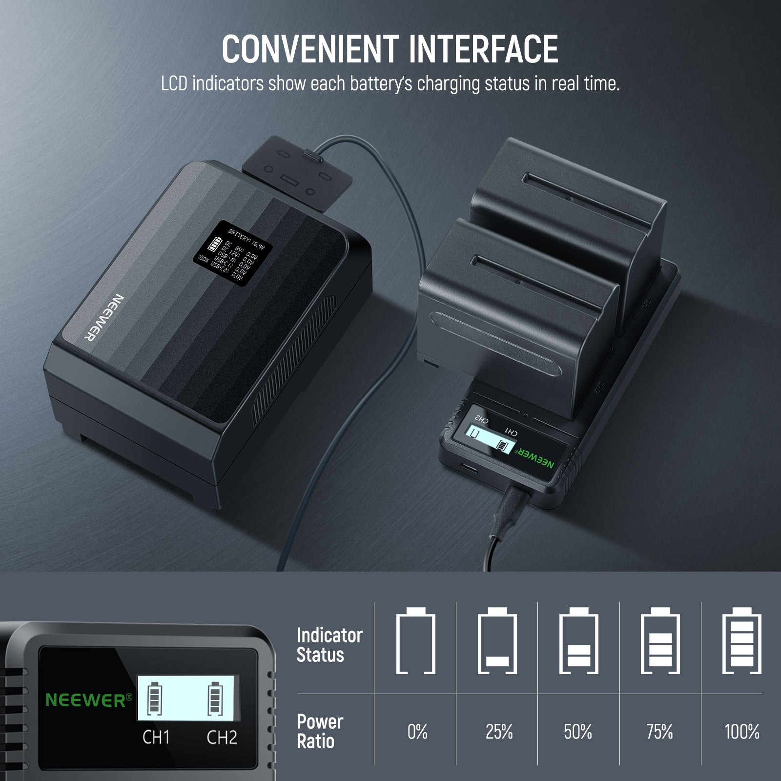- Dual Battery Charging- You can charge two compatible NP-F batteries simultaneously by placing them on the charger correctly. The fast npf battery charger has an LCD that lets you know the charging status in real time