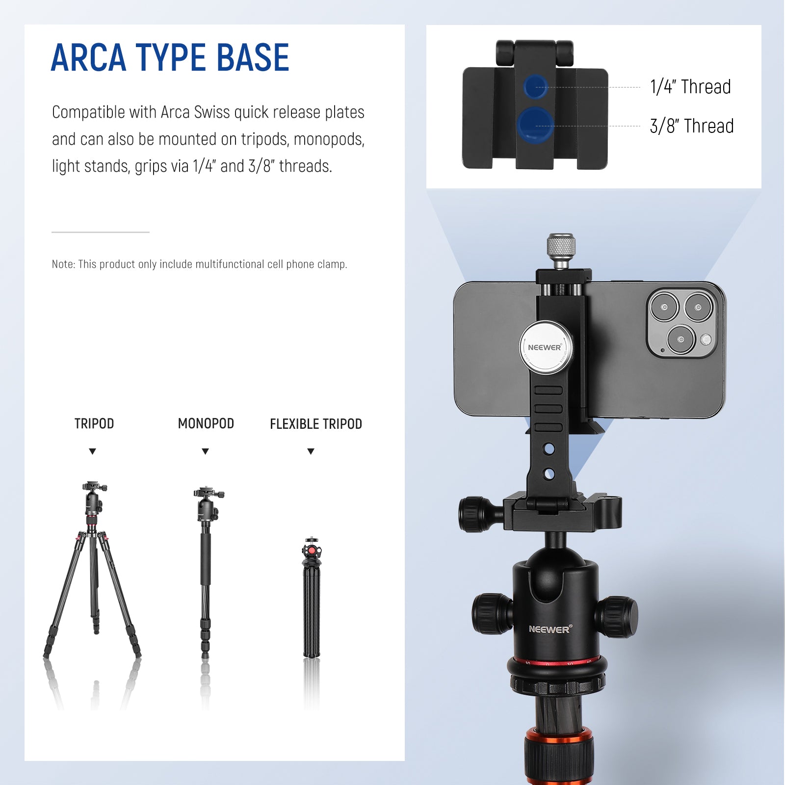 - Arca Type Base for Tripod Mounting- Designed with an Arca type base, the smartphone tripod mount can be attached to a compatible quick-release plate, or it can mount on a tripod, monopod, light stand, handgrip, and other supports via the 1/4” and 3/8” threads