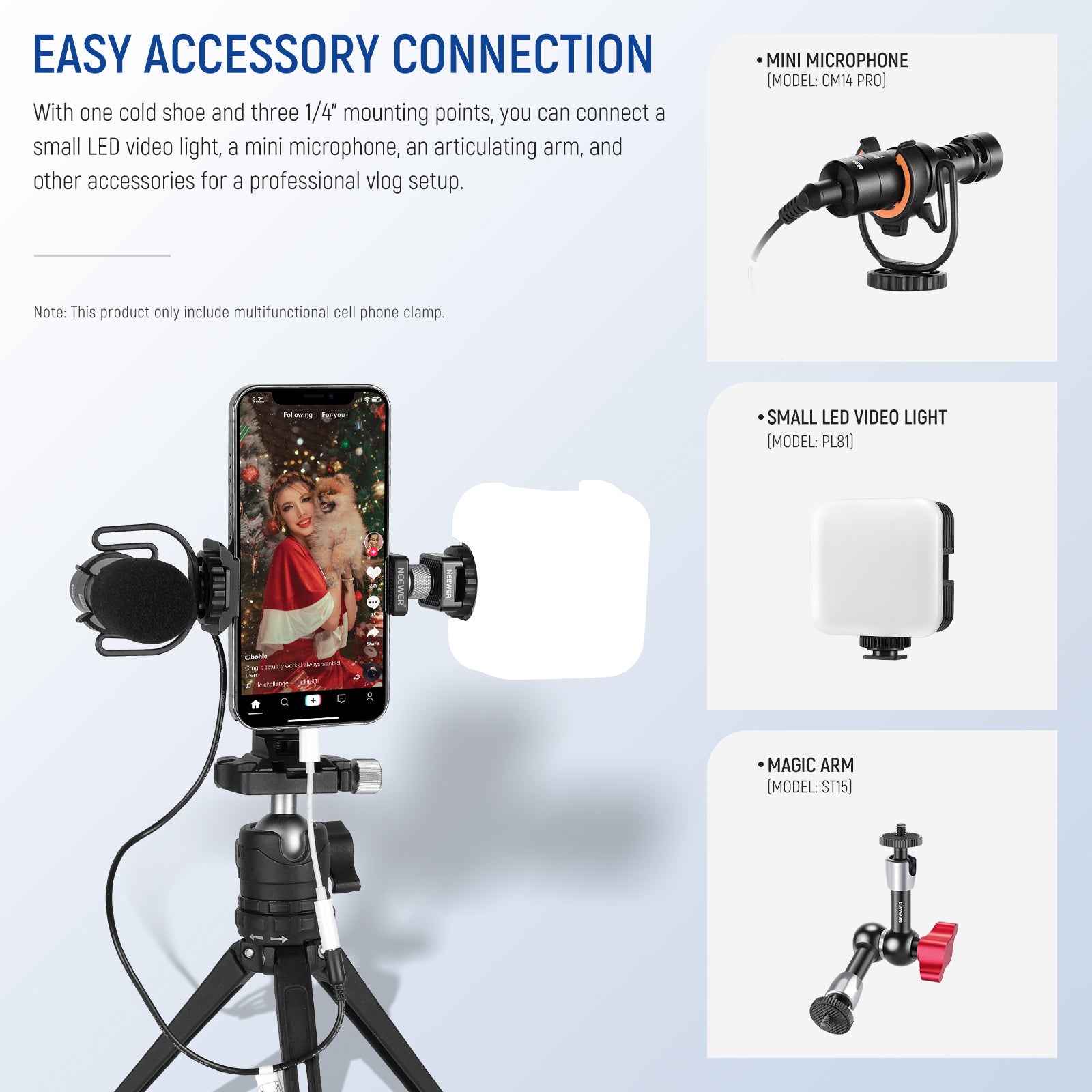 - Easy Accessory Connection- With one cold shoe and three 1/4” mounting points, you can connect a small LED video light, a mini microphone, an articulating arm, and other accessories for a professional vlog setup