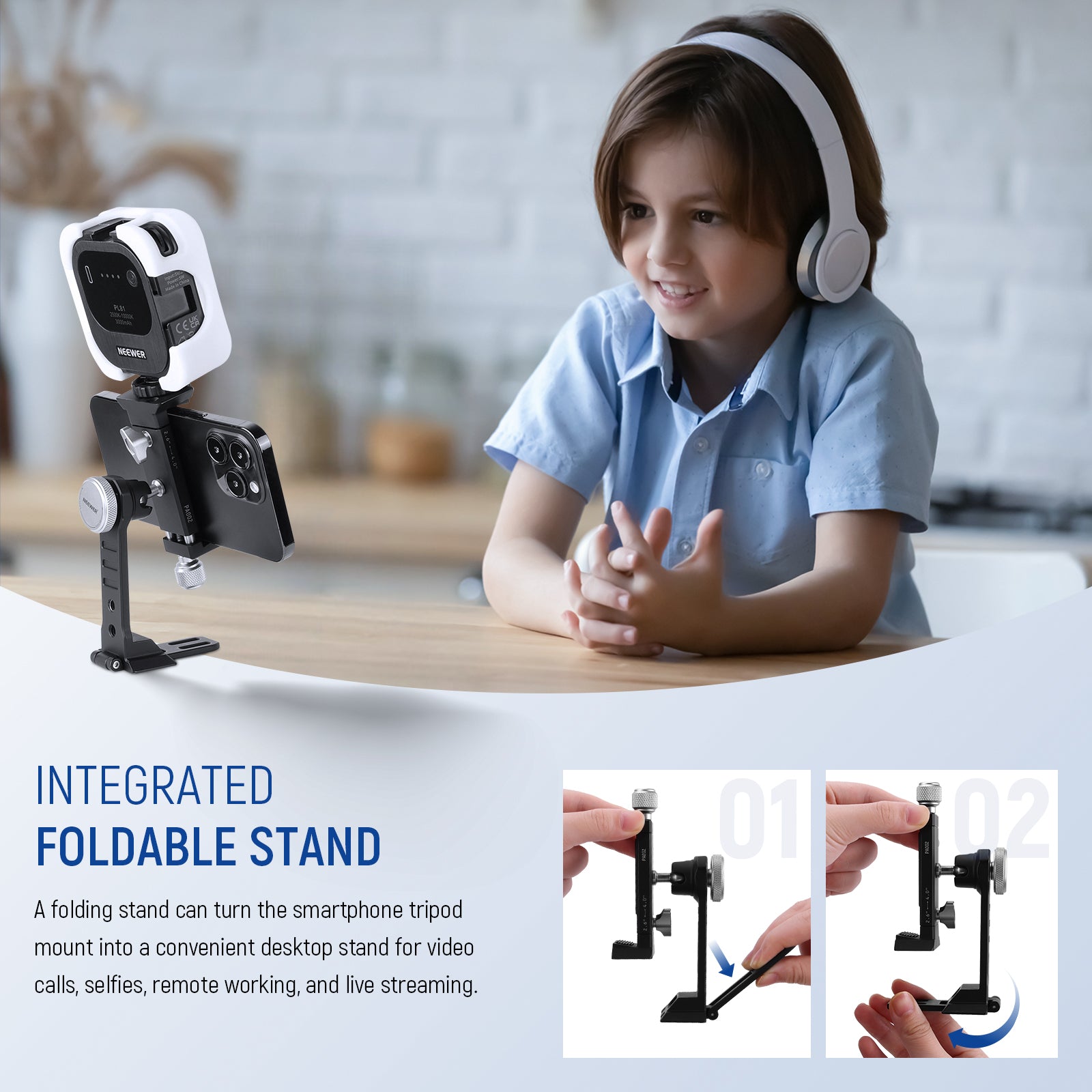 - Integrated Foldable Stand- A folding stand is incorporated into the smartphone tripod mount and transforms the mount into an independent desktop stand for video calls, selfies, remote working, and live streaming