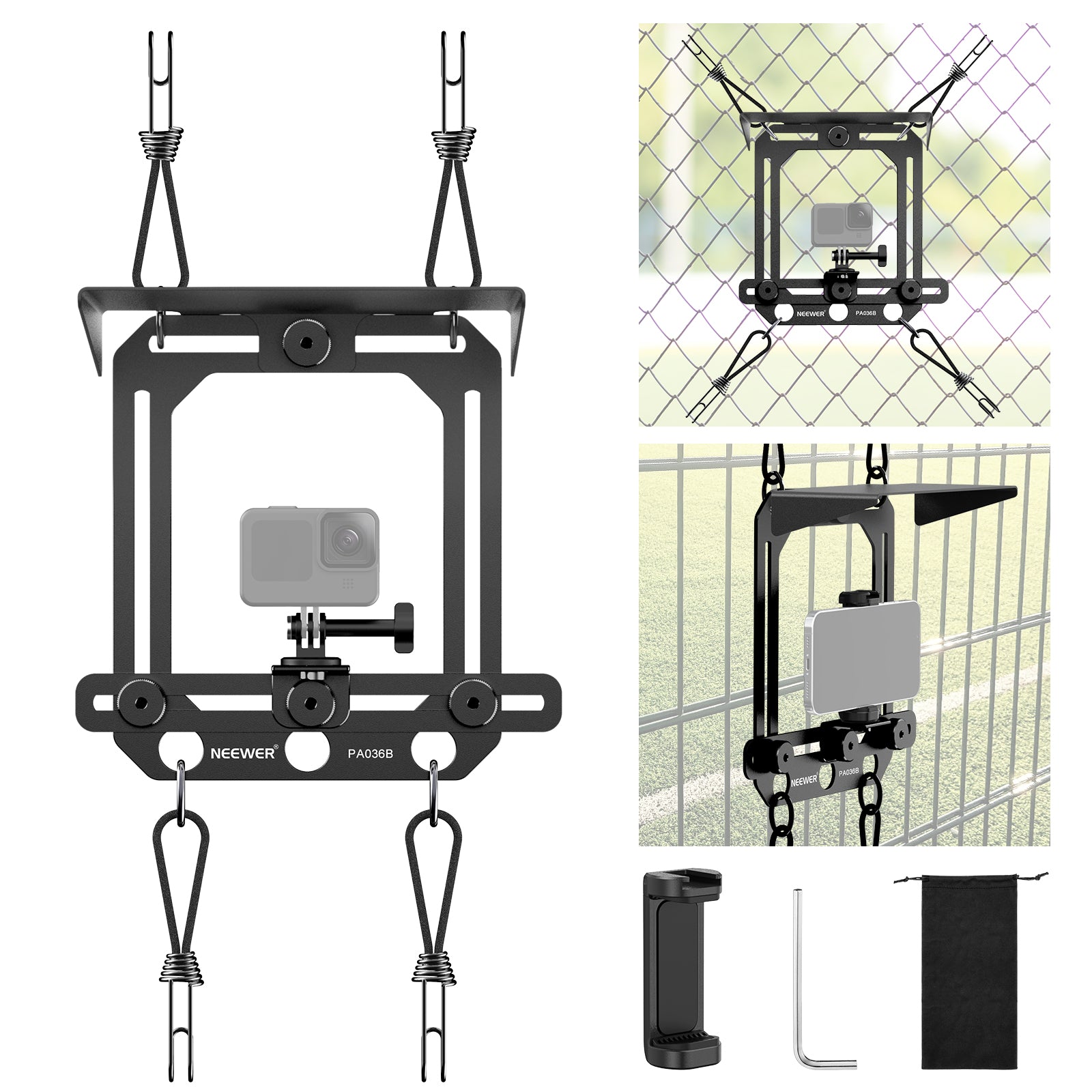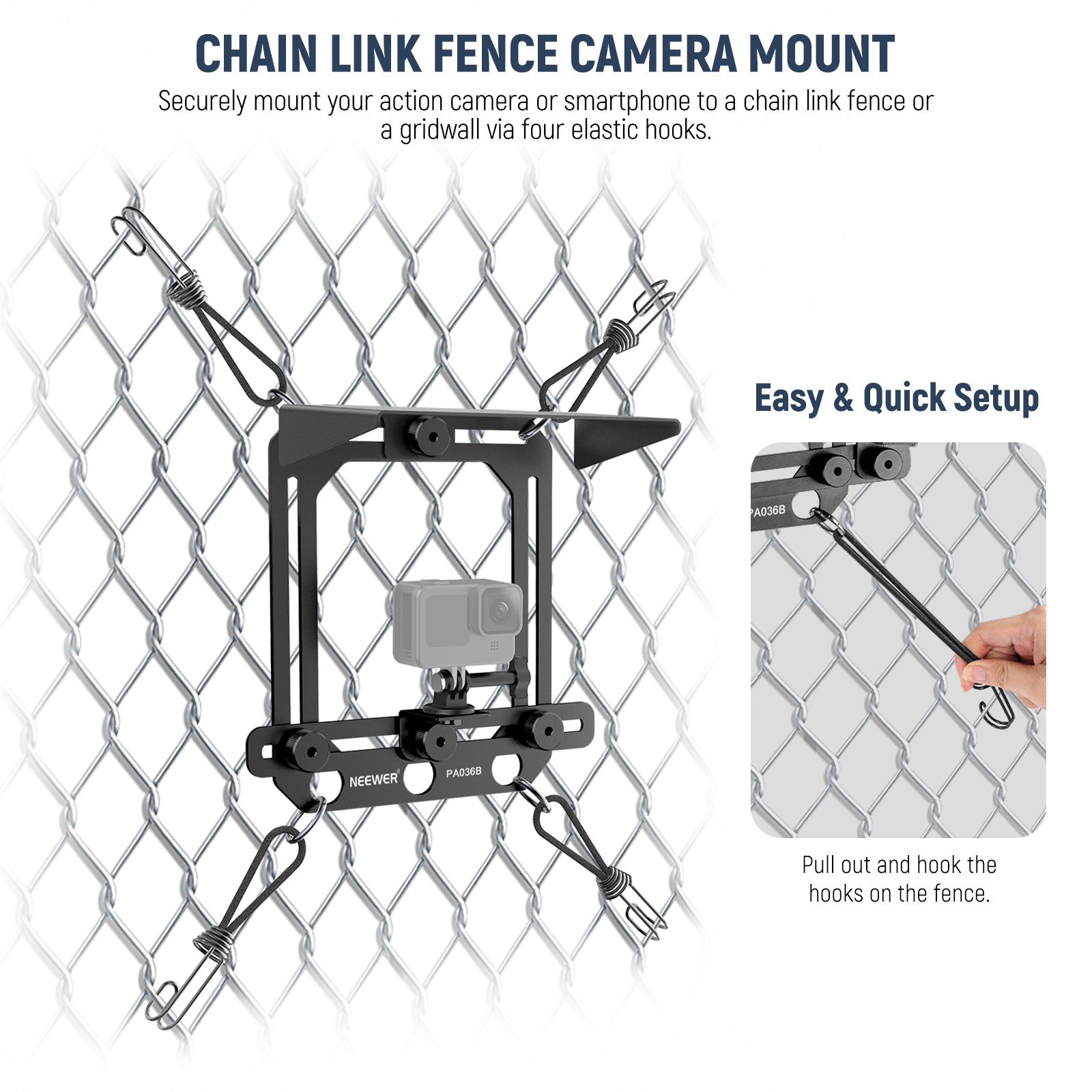 - Metal Build & Sunshade Included- Made of premium aluminum alloy, the action camera fence holder is robust yet compact, and can withstand daily use for long lasting use. You can easily hang the phone mount to the fence using the four elastic hooks, allowing for handy video recording while safeguarding your device from accidental drops. Also includes a sunshade hood to protect against rain and reduce glare in bright conditions