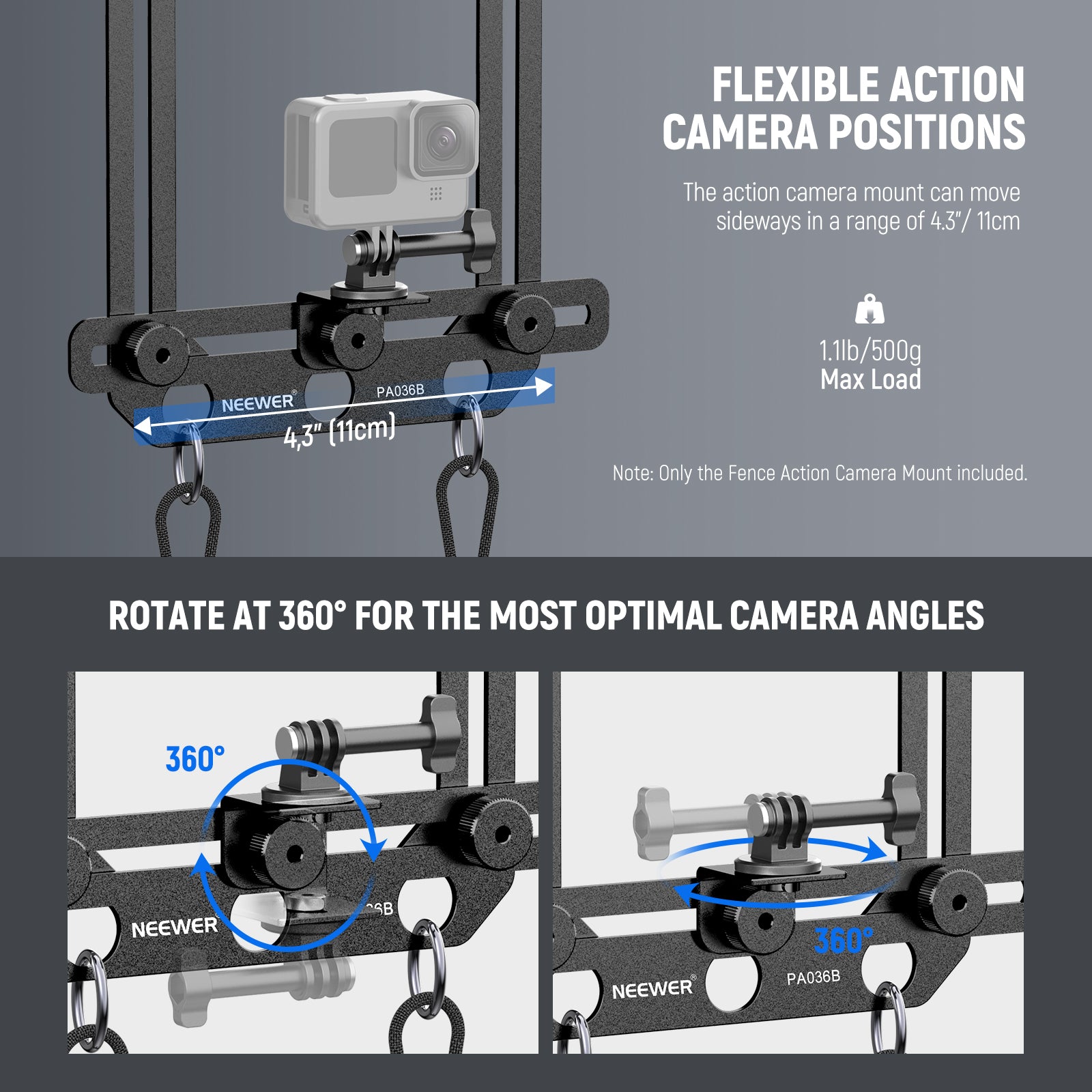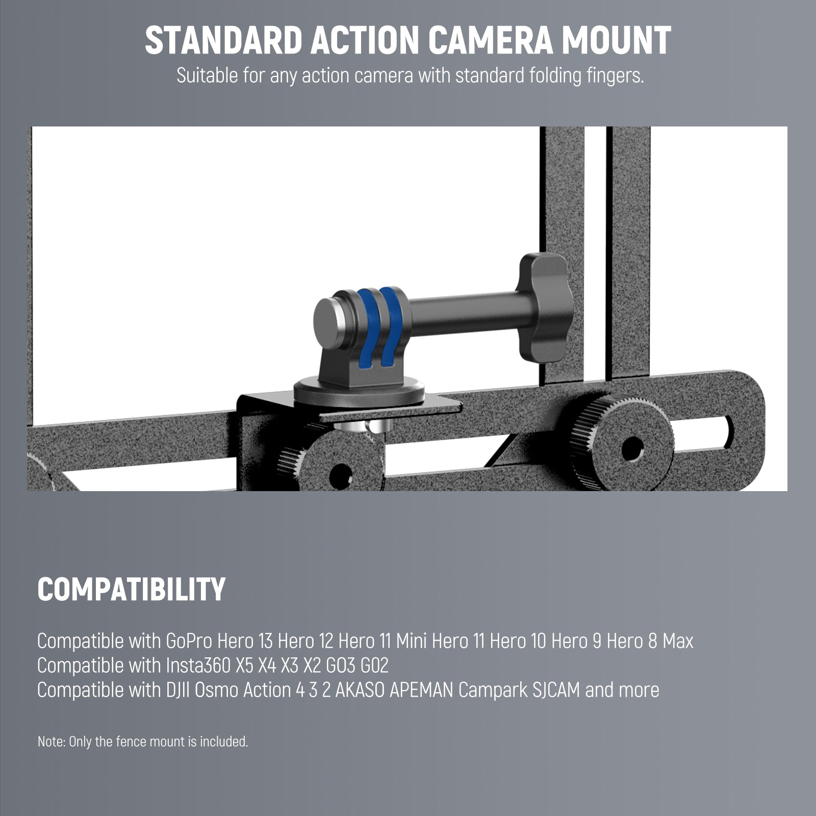 - Multiple Device Expansion- With a 1/4" screw on the platform to install the phone holder or action camera adapter, the fence mount also features a 1/4" expansion hole on each of the screw knobs, to connect magic arms and other supports for multi camera shooting. Ideal for content creator essential photography accessories and influencer must have gear