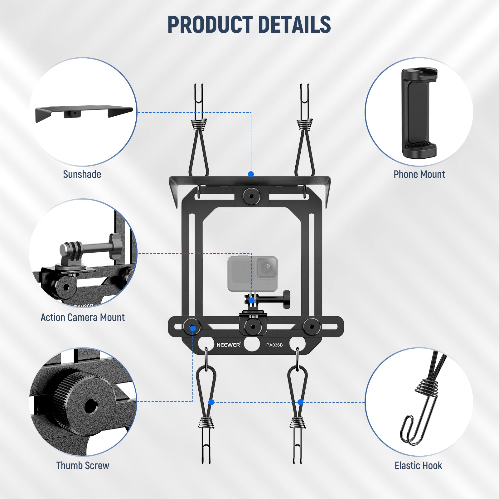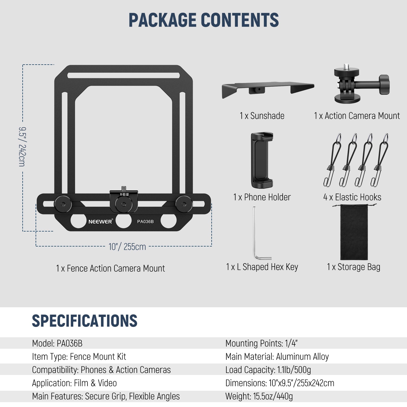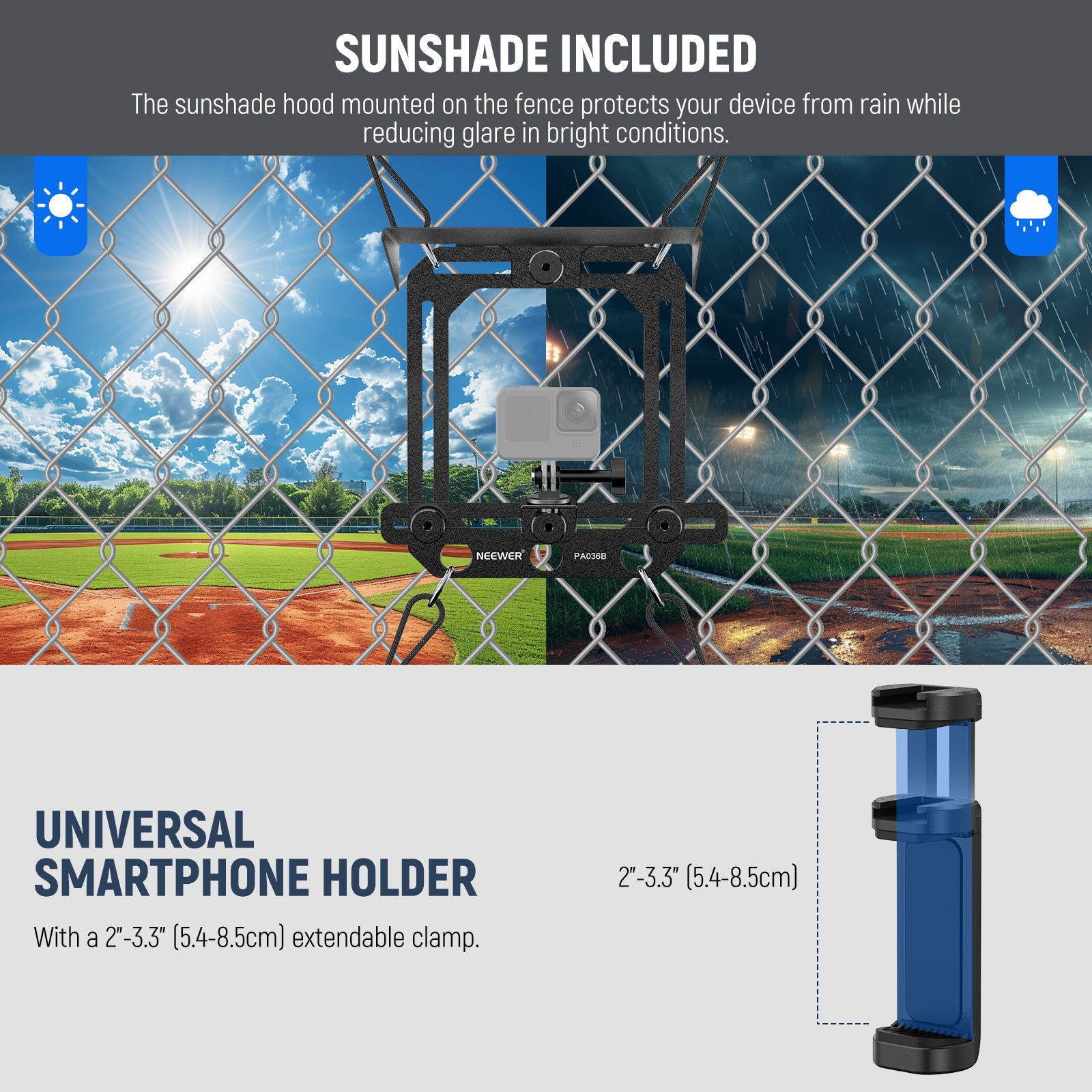- Flexible Mounting & Sunshade Included- The phone fence mount slides your device left to right along the bottom rail and features adjustable knobs for up and down adjustment without obstructing the screen, and all are secured by hand tightening screw knobs. The phone holder included supports portrait shooting, while the action camera adapter offers a 180° tilt for optimal angles