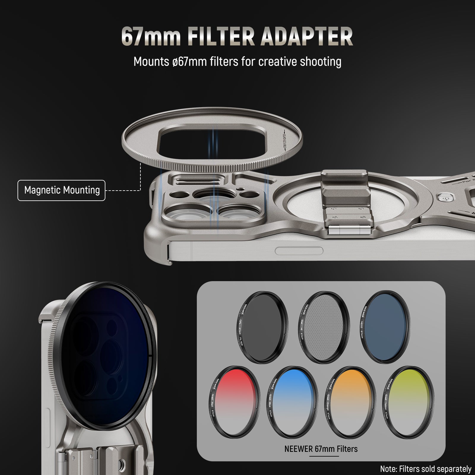 - Quick Release 67mm Filter Adapter- The snap on 67mm filter adapter attaches to the frame in seconds and allows you to mount any 67mm filter, including ND, CPL, black diffusion, white diffusion, and gradient color filters, for artistic and expressive shooting