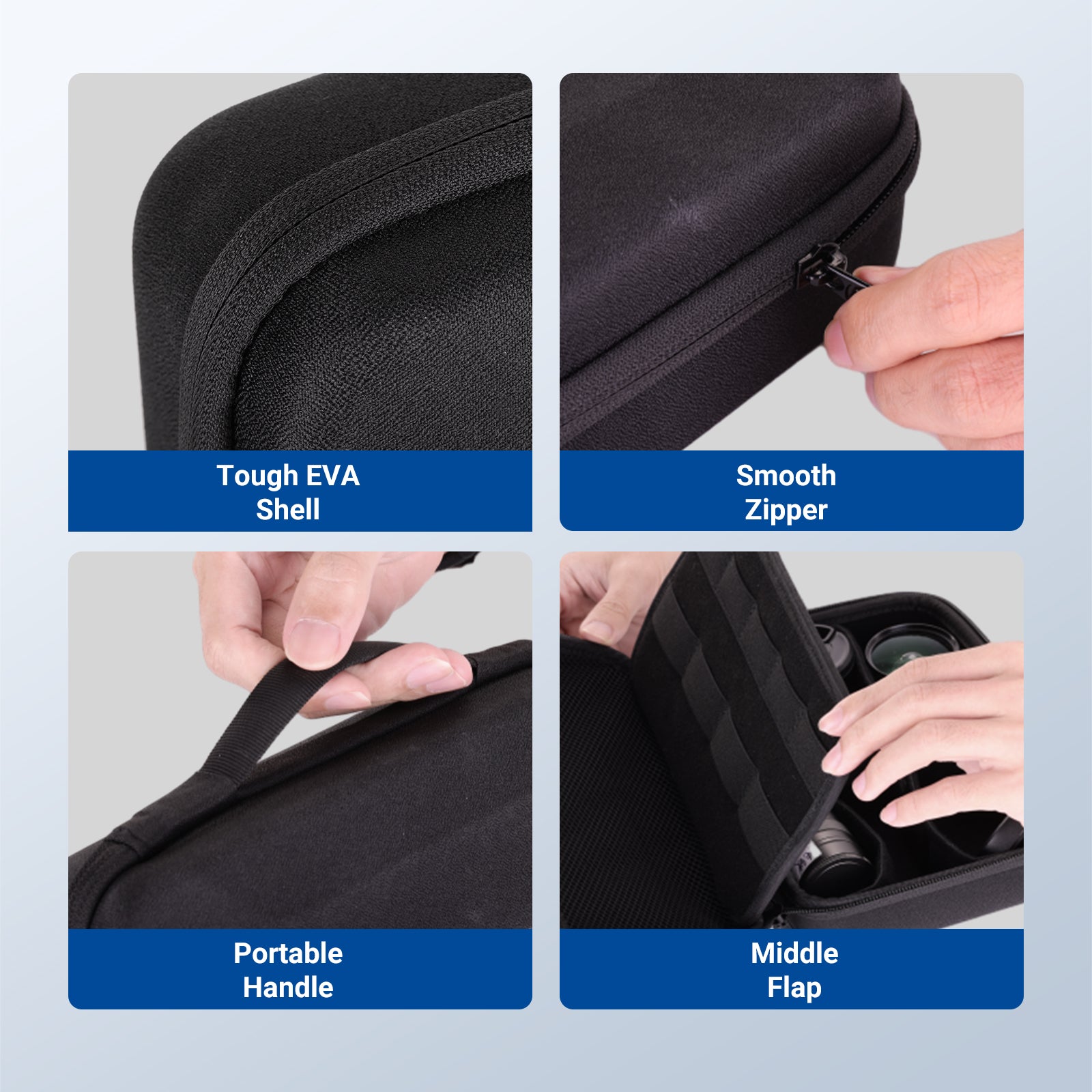 - Protective EVA Shell- 3 layer hybrid shockproof EVA camera case hard shell with scratch resistant fleece lining, plus nylon coating for wear resistance and a sleek appearance
