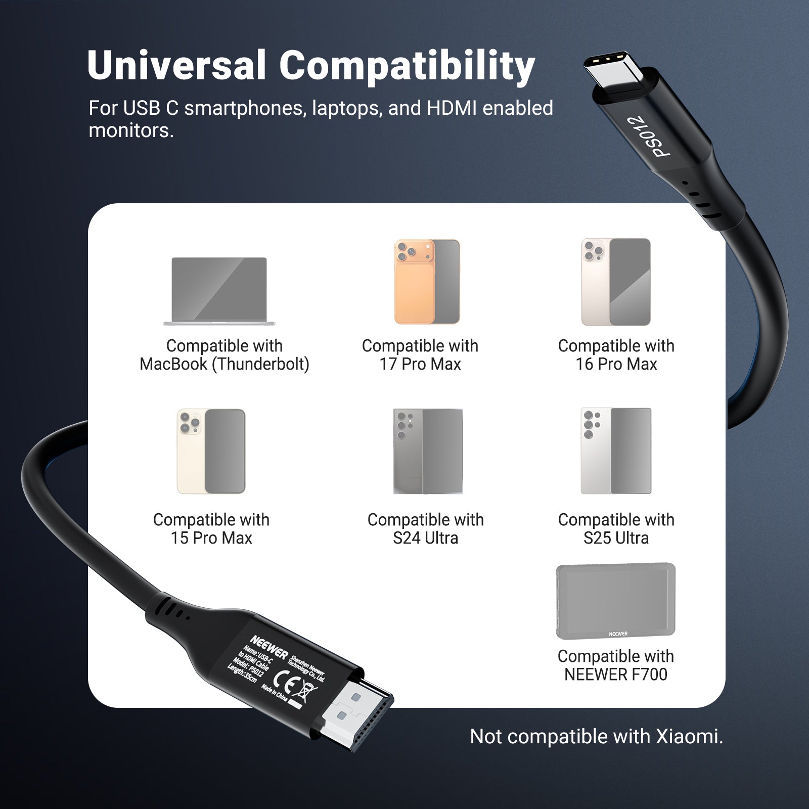 - Wide Device Compatibility- This USB C to HDMI adapter cable is compatible with iPhone 17 Pro Max 16 Pro Max 15 Pro Max S24 Ultra S25 Ultra MacBook/Mac (Thunderbolt) and other USB C devices as audio video accessories, plus HDMI enabled camera field monitors like NEEWER F550 Pro. Not compatible with Xiaomi