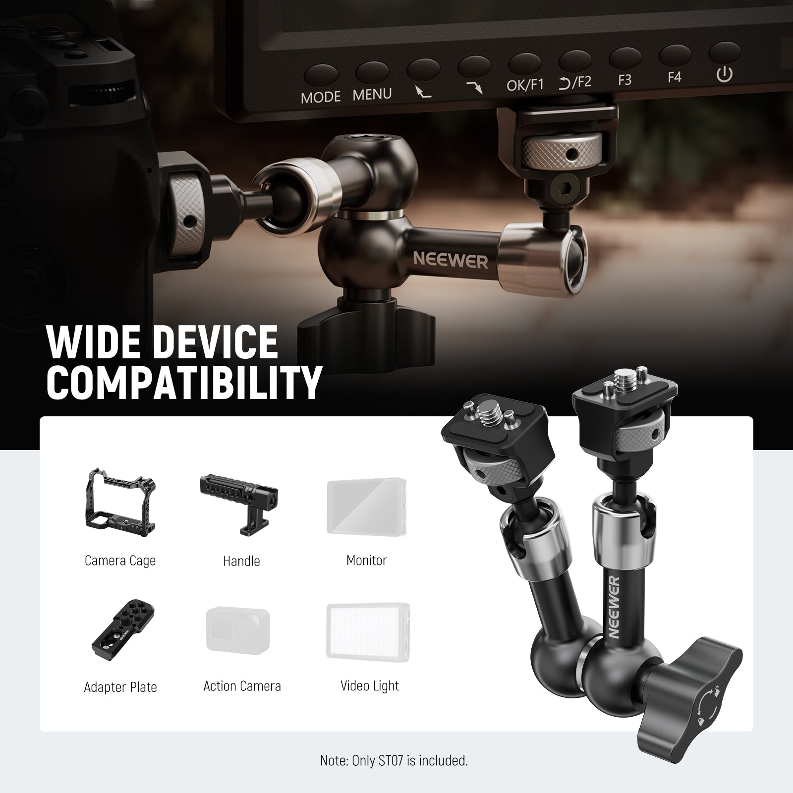 - Wide Device Compatibility- This magic arm work perfectly with NEEWER Super Clamp, GP-7 Action Camera Mount, GP-3 Phone Holder with Cold Shoe Adapter, CA013 Suction Cup Mount, F100/F400 PRO/F500 Camera Field Monitor, RGB61/RGB62/RGB176-A1/PL81 LED Video Light. Also compatible with GoPro accessories compatible with Insta 360 x3 accessories compatible with Insta 360 x4 accessories