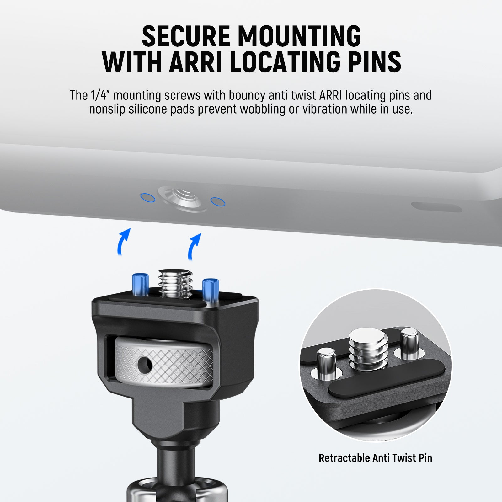 - Secure Mounting with ARRI Locating Pins- The 1/4" mounting screws with anti twist retractable ARRI locating pins and nonslip silicone pads prevent wobbling or vibration while in use. The thumbscrews can be tightened by hand for tool free setup