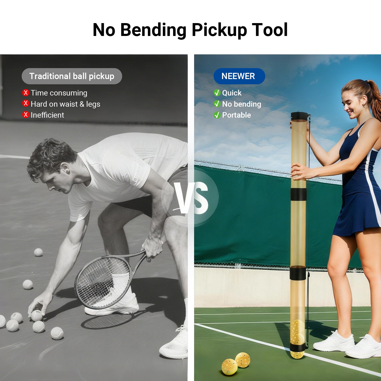 - No Bending Pickup Tool- Simply press the tube over a ball to pick it up—no bending required. Clear PC material lets you instantly see how many balls you've collected and ensures high durability for everyday use
