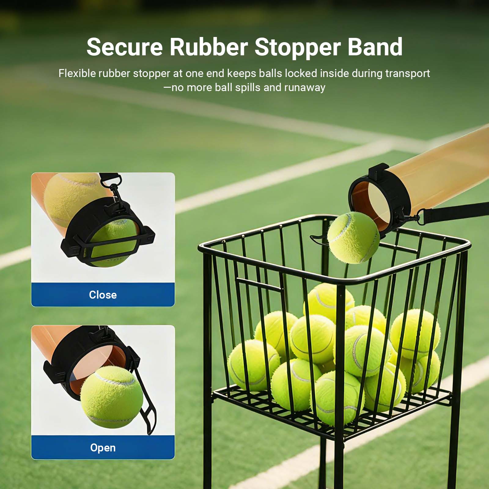 - Secure Rubber Stopper Band- Flexible rubber stopper at one end keeps balls locked inside during transport—no more ball spills and runaway