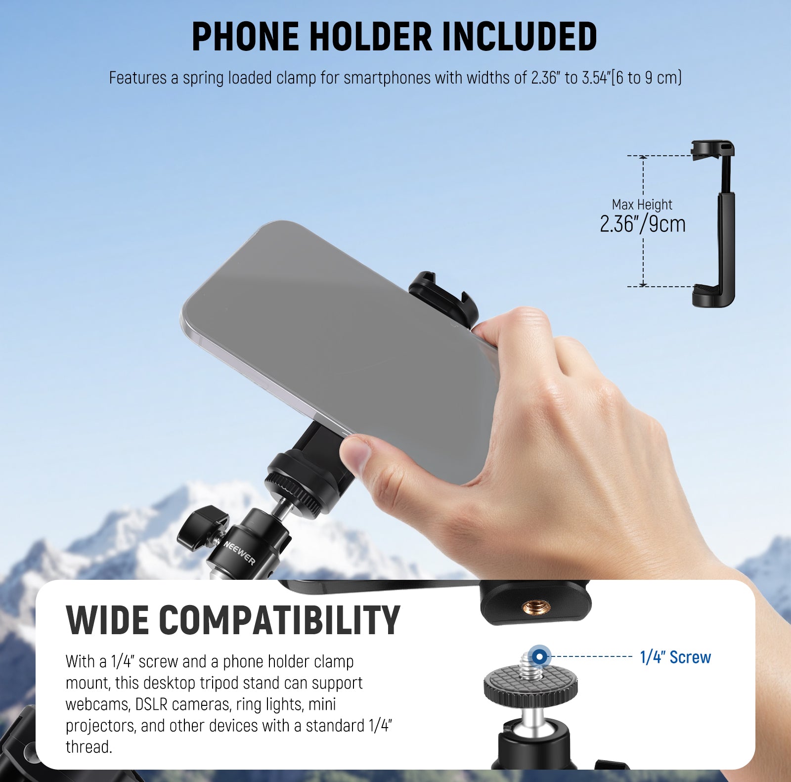 NEEWER offers professional mini tripods for you. These travel tripods can securely mount a DSLR camera, webcam, action camera, or smartphone, making them suitable for both handheld and desktop use. They are ideal for vlogging, live streaming, video recording, filmmaking, and more. Choose a good mini tripod for your photography and videography.